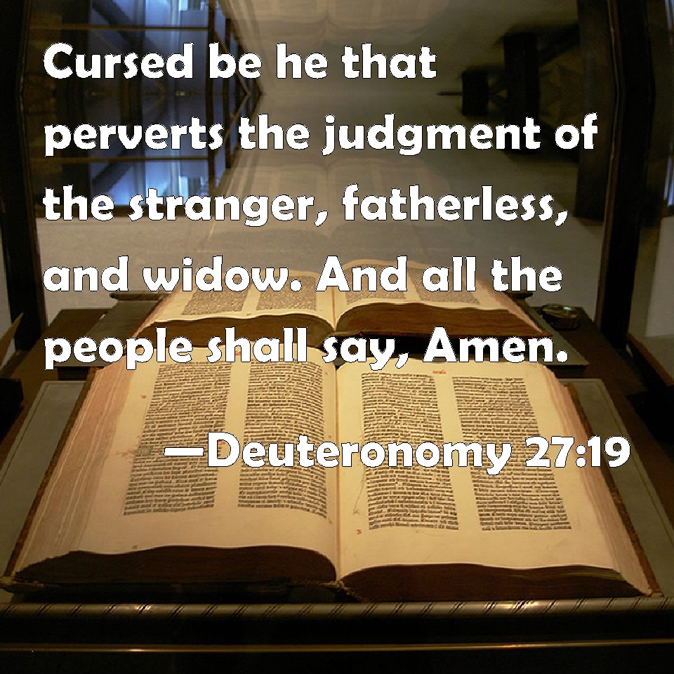 Choose a Background Deuteronomy 27:19 Cursed be he that perverts the judgment of the stranger, fatherless, and widow. And all the people shall say, Amen. KJV: Cursed be he that perverteth the judgment of the stranger, fatherless, and widow. And all the people shall say, Amen. DRB: Cursed be he that perverteth the judgment of the stranger, of the fatherless and the widow: and all the people shall say: Amen. DBT: Cursed be he that perverteth the judgment of the stranger, fatherless, and widow! And all the people shall say, Amen. ERV: Cursed be he that wresteth the judgment of the stranger, fatherless, and widow. And all the people shall say, Amen. WBT: Cursed be he that perverteth the judgment of the stranger, fatherless, and widow: and all the people shall say, Amen. WEB: 'Cursed is he who wrests the justice [due] to the foreigner, fatherless, and widow.' All the people shall say, 'Amen.' YLT: Cursed is he who is turning aside the judgment of fatherless, sojourner, and widow, — and all the people have said, Amen.Links Deuteronomy 27:19 NIV • Deuteronomy 27:19 NLT • Deuteronomy 27:19 ESV • Deuteronomy 27:19 NASB • Deuteronomy 27:19 KJV • Deuteronomy 27:19 Interlinear • Deuteronomy 27:19 Commentaries • Deuteronomy 27:19 Parallel Texts • Deuteronomy 27:19 Bible Apps • Deuteronomy 27:19 Parallel • Bible Hub |