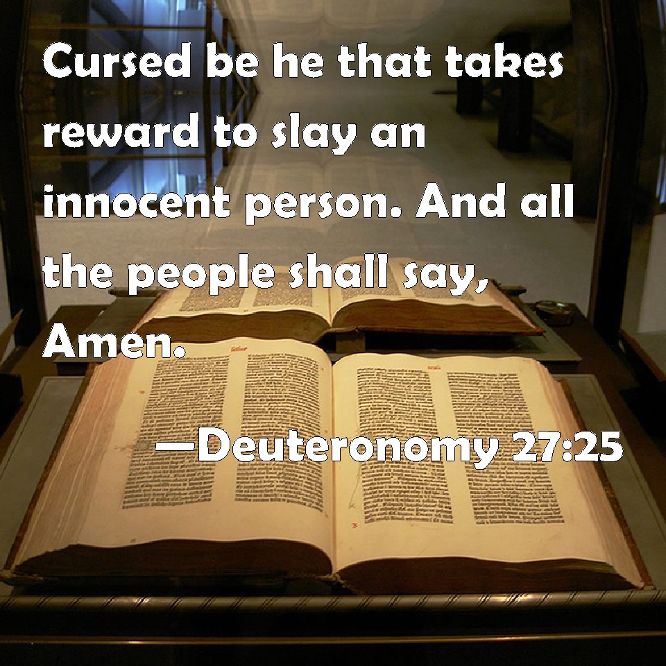 Choose a Background Deuteronomy 27:25 Cursed be he that takes reward to slay an innocent person. And all the people shall say, Amen. KJV: Cursed be he that taketh reward to slay an innocent person. And all the people shall say, Amen. DRB: Cursed be he that taketh gifts, to slay an innocent person: and all the people shall say: Amen. DBT: Cursed be he that taketh reward to smite mortally shedding innocent blood! And all the people shall say, Amen. ERV: Cursed be he that taketh reward to slay an innocent person. And all the people shall say, Amen. WBT: Cursed be he that taketh reward to slay an innocent person: and all the people shall say, Amen. WEB: 'Cursed is he who takes a bribe to kill an innocent person.' All the people shall say, 'Amen.' YLT: Cursed is he who is taking a bribe to smite a person, innocent blood, — and all the people have said, Amen.Links Deuteronomy 27:25 NIV • Deuteronomy 27:25 NLT • Deuteronomy 27:25 ESV • Deuteronomy 27:25 NASB • Deuteronomy 27:25 KJV • Deuteronomy 27:25 Interlinear • Deuteronomy 27:25 Commentaries • Deuteronomy 27:25 Parallel Texts • Deuteronomy 27:25 Bible Apps • Deuteronomy 27:25 Parallel • Bible Hub |