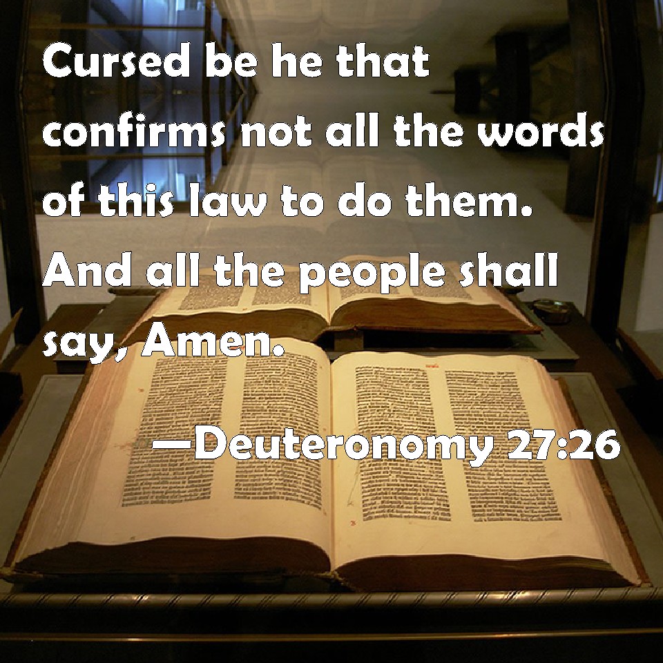 Choose a Background Deuteronomy 27:26 Cursed be he that confirms not all the words of this law to do them. And all the people shall say, Amen. KJV: Cursed be he that confirmeth not all the words of this law to do them. And all the people shall say, Amen. DRB: Cursed be he that abideth not in the words of this law, and fulfilleth them not in work: and all the people shall say: Amen. DBT: Cursed be he that confirmeth not the words of this law to do them! And all the people shall say, Amen. ERV: Cursed be he that confirmeth not the words of this law to do them. And all the people shall say, Amen. WBT: Cursed be he that confirmeth not all the words of this law to do them: and all the people shall say, Amen. WEB: 'Cursed is he who doesn't confirm the words of this law to do them.' All the people shall say, 'Amen.'" YLT: Cursed is he who doth not establish the words of this law, to do them, — and all the people have said, Amen.Links Deuteronomy 27:26 NIV • Deuteronomy 27:26 NLT • Deuteronomy 27:26 ESV • Deuteronomy 27:26 NASB • Deuteronomy 27:26 KJV • Deuteronomy 27:26 Interlinear • Deuteronomy 27:26 Commentaries • Deuteronomy 27:26 Parallel Texts • Deuteronomy 27:26 Bible Apps • Deuteronomy 27:26 Parallel • Bible Hub |