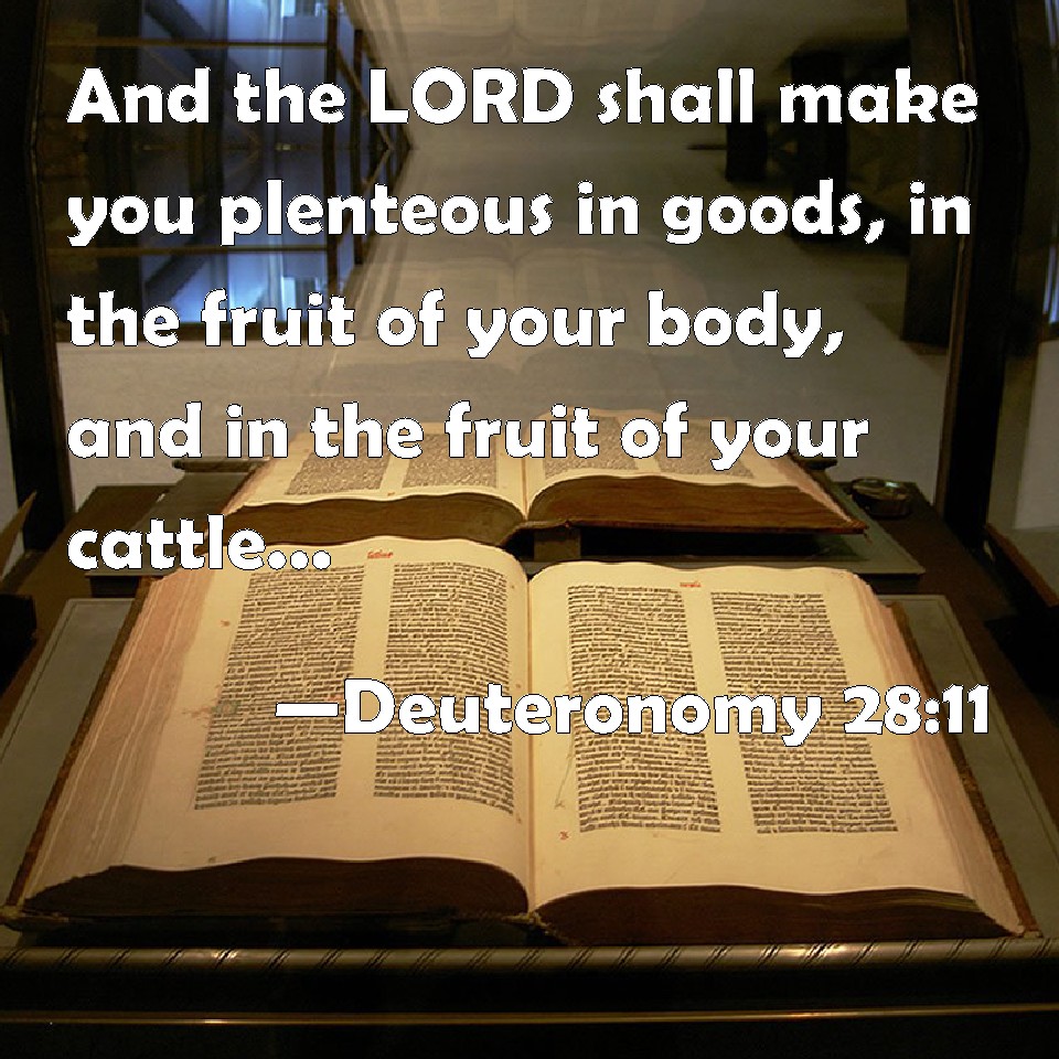 Choose a Background Deuteronomy 28:11 And the LORD shall make you plenteous in goods, in the fruit of your body, and in the fruit of your cattle, and in the fruit of your ground, in the land which the LORD swore to your fathers to give you. KJV: And the LORD shall make thee plenteous in goods, in the fruit of thy body, and in the fruit of thy cattle, and in the fruit of thy ground, in the land which the LORD sware unto thy fathers to give thee. DRB: The Lord will make thee abound with all goods, with the fruit of thy womb, and the fruit of thy cattle, with the fruit of thy land, which the Lord swore to thy fathers that he would give thee. DBT: And Jehovah will give thee abundance of good, in the fruit of thy body, and in the fruit of thy cattle, and in the fruit of thy ground, in the land that Jehovah swore unto thy fathers to give thee. ERV: And the LORD shall make thee plenteous for good, in the fruit of thy body, and in the fruit of thy cattle, and in the fruit of thy ground, in the land which the LORD sware unto thy fathers to give thee. WBT: And the LORD shall make thee to abound in goods, in the fruit of thy body, and in the fruit of thy cattle, and in the fruit of thy ground, in the land which the LORD swore to thy fathers to give thee. WEB: Yahweh will make you plenteous for good, in the fruit of your body, and in the fruit of your livestock, and in the fruit of your ground, in the land which Yahweh swore to your fathers to give you. YLT: 'And Jehovah hath made thee abundant in good, in the fruit of the womb, and in the fruit of thy cattle, and in the fruit of thy ground, on the ground which Jehovah hath sworn to thy fathers to give to thee.Links Deuteronomy 28:11 NIV • Deuteronomy 28:11 NLT • Deuteronomy 28:11 ESV • Deuteronomy 28:11 NASB • Deuteronomy 28:11 KJV • Deuteronomy 28:11 Interlinear • Deuteronomy 28:11 Commentaries • Deuteronomy 28:11 Parallel Texts • Deuteronomy 28:11 Bible Apps • Deuteronomy 28:11 Parallel • Bible Hub |