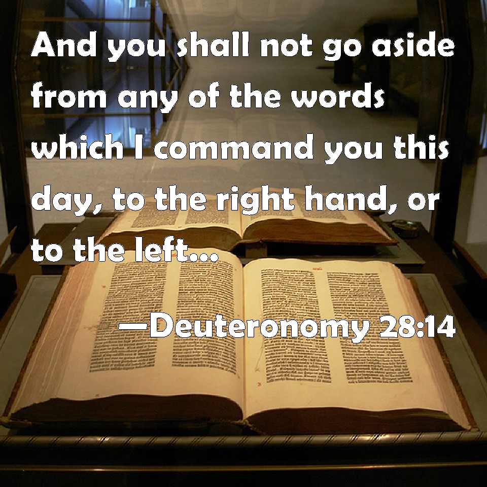 Choose a Background Deuteronomy 28:14 And you shall not go aside from any of the words which I command you this day, to the right hand, or to the left, to go after other gods to serve them. KJV: And thou shalt not go aside from any of the words which I command thee this day, to the right hand, or to the left, to go after other gods to serve them. DRB: And turn not away from them neither to the right hand, nor to the left, nor follow strange gods, nor worship them. DBT: and if thou turn not aside from any of the words that I command thee this day, to the right hand or to the left, to go after other gods to serve them. ERV: and shalt not turn aside from any of the words which I command you this day, to the right hand, or to the left, to go after other gods to serve them. WBT: And thou shalt not go aside from any of the words which I command thee this day, to the right hand or to the left, to go after other gods to serve them. WEB: and shall not turn aside from any of the words which I command you this day, to the right hand, or to the left, to go after other gods to serve them. YLT: and thou dost not turn aside from all the words which I am commanding you to-day — right or left — to go after other gods, to serve them.Links Deuteronomy 28:14 NIV • Deuteronomy 28:14 NLT • Deuteronomy 28:14 ESV • Deuteronomy 28:14 NASB • Deuteronomy 28:14 KJV • Deuteronomy 28:14 Interlinear • Deuteronomy 28:14 Commentaries • Deuteronomy 28:14 Parallel Texts • Deuteronomy 28:14 Bible Apps • Deuteronomy 28:14 Parallel • Bible Hub |