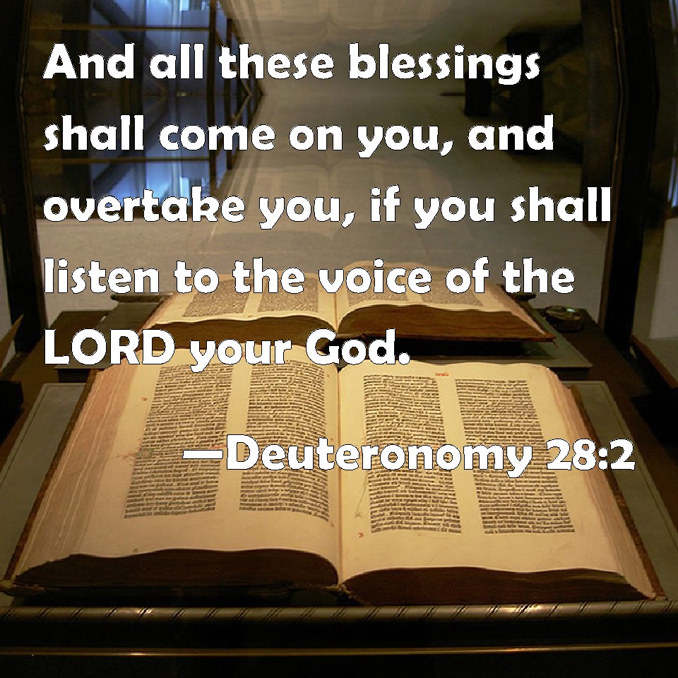 Choose a Background Deuteronomy 28:2 And all these blessings shall come on you, and overtake you, if you shall listen to the voice of the LORD your God. KJV: And all these blessings shall come on thee, and overtake thee, if thou shalt hearken unto the voice of the LORD thy God. DRB: And all these blessings shall come upon thee and overtake thee: yet so if thou hear his precepts, DBT: and all these blessings shall come on thee and overtake thee, if thou shalt hearken unto the voice of Jehovah thy God. ERV: and all these blessings shall come upon thee, and overtake thee, if thou shalt hearken unto the voice of the LORD thy God. WBT: And all these blessings shall come on thee, and overtake thee, if thou shalt hearken to the voice of the LORD thy God. WEB: and all these blessings shall come on you, and overtake you, if you shall listen to the voice of Yahweh your God. YLT: and all these blessings have come upon thee, and overtaken thee, because thou dost hearken to the voice of Jehovah thy God:Links Deuteronomy 28:2 NIV • Deuteronomy 28:2 NLT • Deuteronomy 28:2 ESV • Deuteronomy 28:2 NASB • Deuteronomy 28:2 KJV • Deuteronomy 28:2 Interlinear • Deuteronomy 28:2 Commentaries • Deuteronomy 28:2 Parallel Texts • Deuteronomy 28:2 Bible Apps • Deuteronomy 28:2 Parallel • Bible Hub |