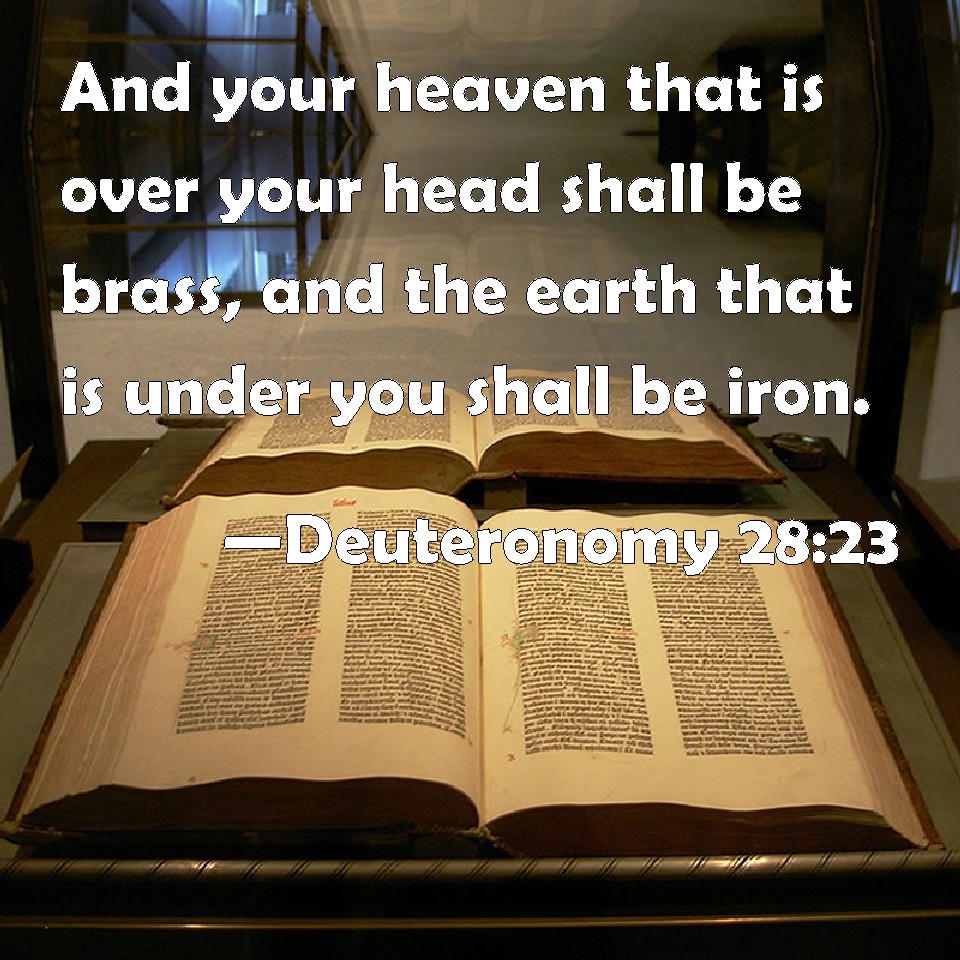 Choose a Background Deuteronomy 28:23 And your heaven that is over your head shall be brass, and the earth that is under you shall be iron. KJV: And thy heaven that is over thy head shall be brass, and the earth that is under thee shall be iron. DRB: Be the heaven, that is over thee, of brass: and the ground thou treadest on, of iron. DBT: And thy heavens which are over thy head shall be brass, and the earth which is under thee, iron. ERV: And thy heaven that is over thy head shall be brass, and the earth that is under thee shall be iron. WBT: And thy heaven that is over thy head shall be brass, and the earth that is under thee shall be iron. WEB: Your sky that is over your head shall be brass, and the earth that is under you shall be iron. YLT: And thy heavens which are over thy head have been brass, and the earth which is under thee iron;Links Deuteronomy 28:23 NIV • Deuteronomy 28:23 NLT • Deuteronomy 28:23 ESV • Deuteronomy 28:23 NASB • Deuteronomy 28:23 KJV • Deuteronomy 28:23 Interlinear • Deuteronomy 28:23 Commentaries • Deuteronomy 28:23 Parallel Texts • Deuteronomy 28:23 Bible Apps • Deuteronomy 28:23 Parallel • Bible Hub |