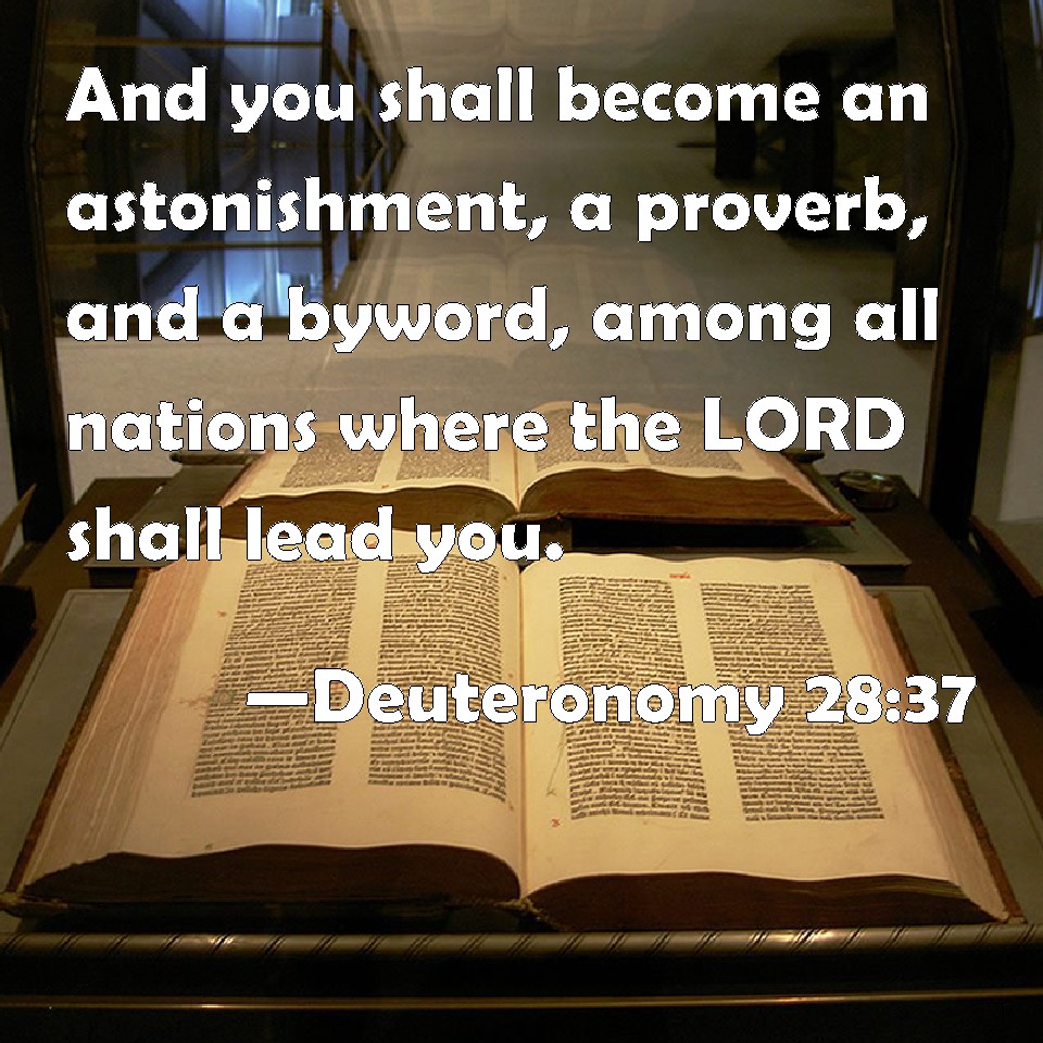 Choose a Background Deuteronomy 28:37 And you shall become an astonishment, a proverb, and a byword, among all nations where the LORD shall lead you. KJV: And thou shalt become an astonishment, a proverb, and a byword, among all nations whither the LORD shall lead thee. DRB: And thou shalt be lost, as a proverb and a byword to all people, among whom the Lord shall bring thee in. DBT: And thou shalt become an astonishment, a proverb, and a byword, among all the peoples whither Jehovah shall lead thee. ERV: And thou shalt become an astonishment, a proverb, and a byword, among all the peoples whither the LORD shall lead thee away. WBT: And thou shalt become an astonishment, a proverb, and a by-word, among all nations whither the LORD shall lead thee. WEB: You shall become an astonishment, a proverb, and a byword, among all the peoples where Yahweh shall lead you away. YLT: and thou hast been for an astonishment, for a simile, and for a byword among all the peoples whither Jehovah doth lead thee.Links Deuteronomy 28:37 NIV • Deuteronomy 28:37 NLT • Deuteronomy 28:37 ESV • Deuteronomy 28:37 NASB • Deuteronomy 28:37 KJV • Deuteronomy 28:37 Interlinear • Deuteronomy 28:37 Commentaries • Deuteronomy 28:37 Parallel Texts • Deuteronomy 28:37 Bible Apps • Deuteronomy 28:37 Parallel • Bible Hub |