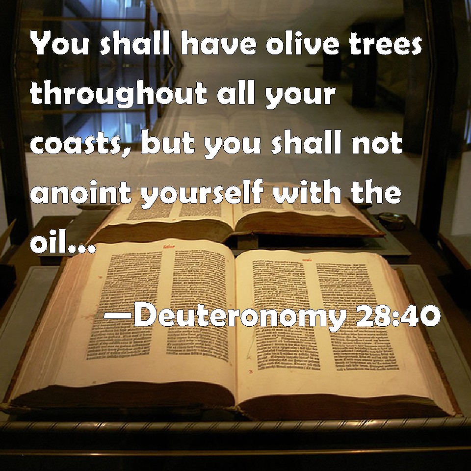 Deuteronomy 28:40 You shall have olive trees throughout all your coasts, but you shall not anoint yourself with the oil; for your olive shall cast his fruit.