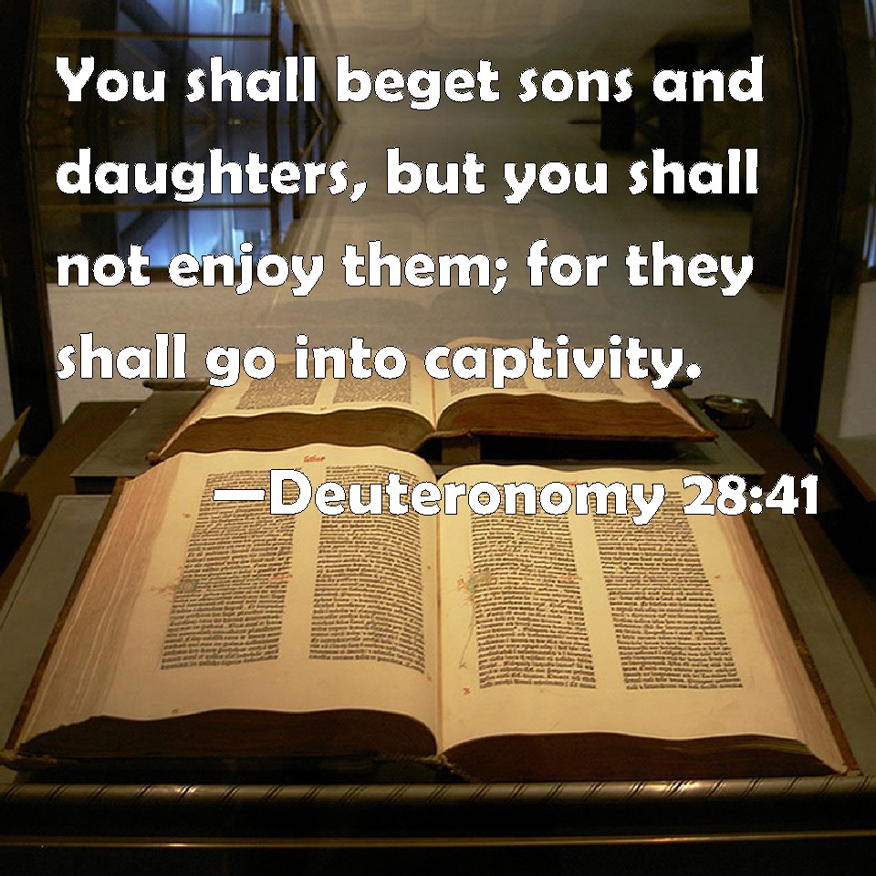 Deuteronomy 28:41 You shall beget sons and daughters, but you shall not enjoy them; for they shall go into captivity.