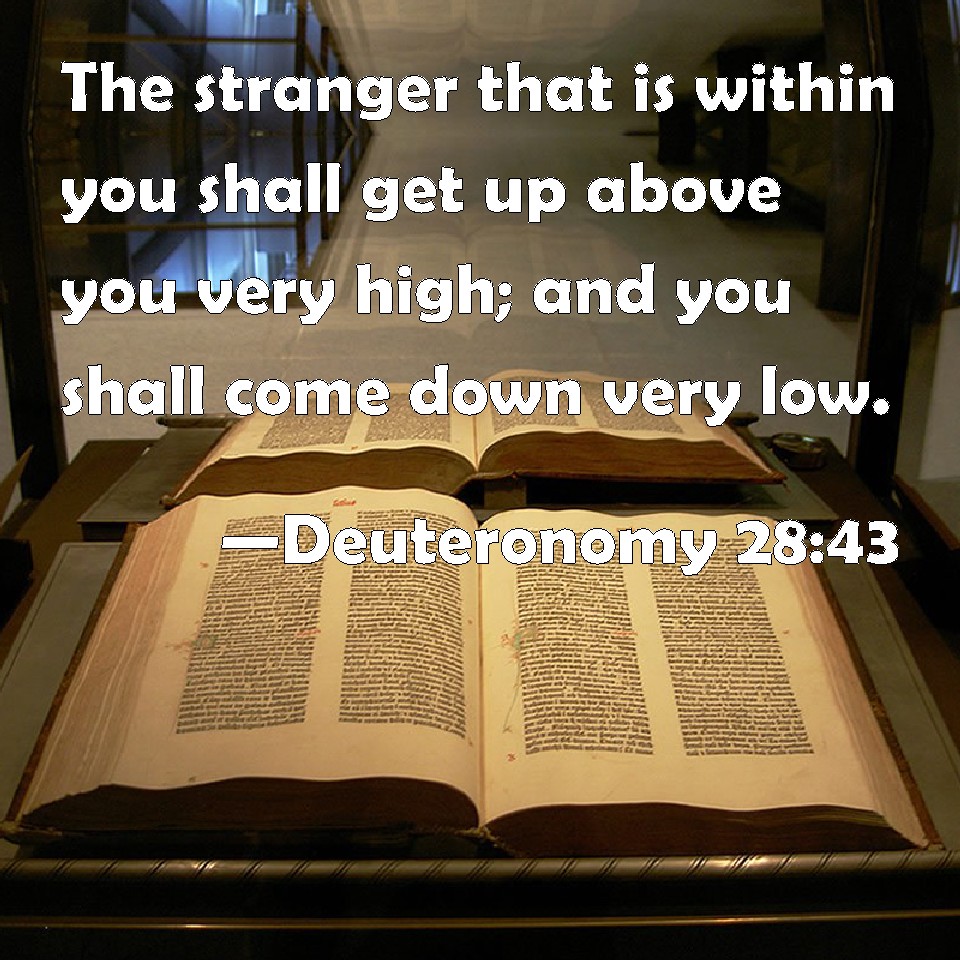 Deuteronomy 28:43 The stranger that is within you shall get up above you very high; and you shall come down very low.