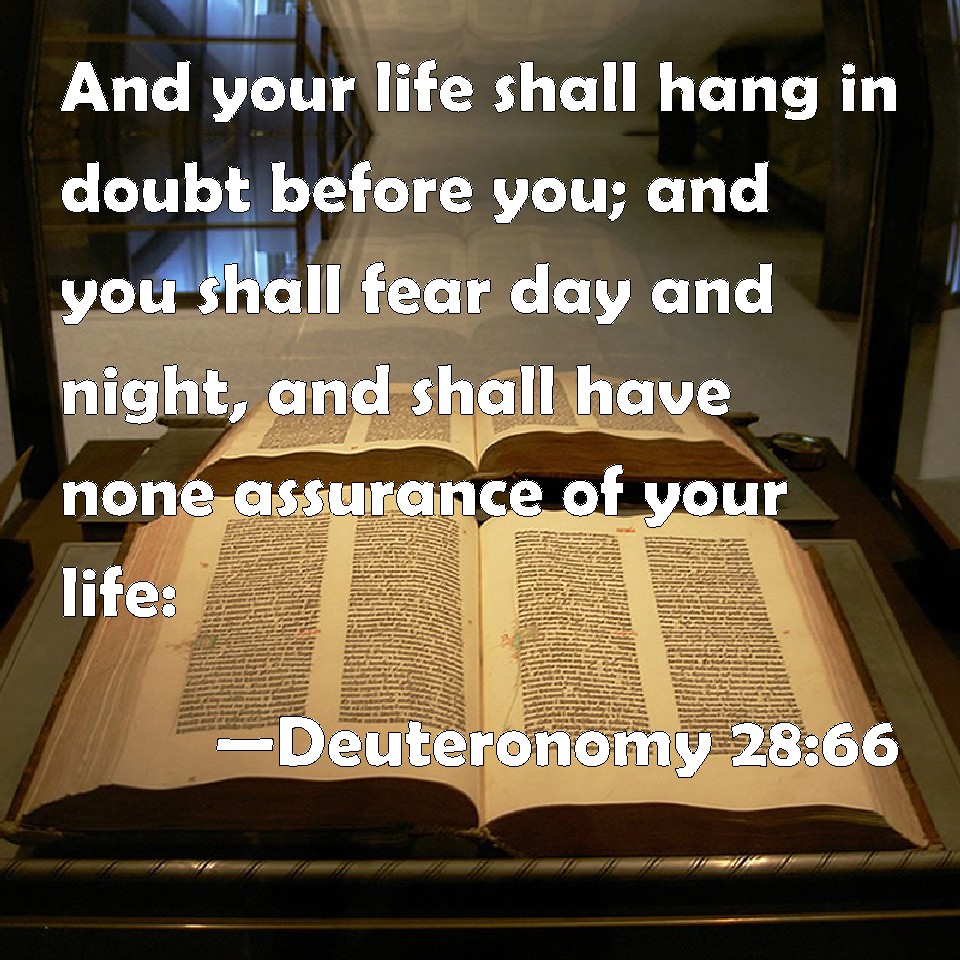 Deuteronomy 28:66 And your life shall hang in doubt before you; and you shall fear day and night, and shall have none assurance of your life: