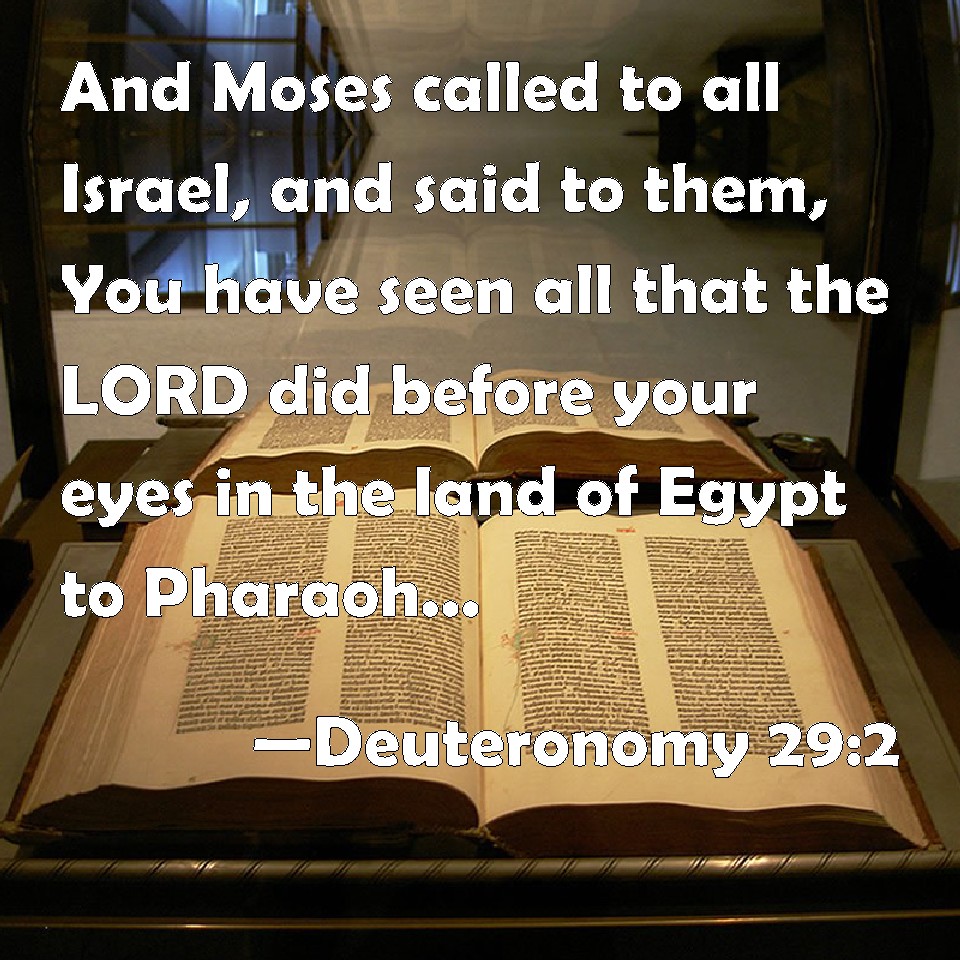 Choose a Background Deuteronomy 29:2 And Moses called to all Israel, and said to them, You have seen all that the LORD did before your eyes in the land of Egypt to Pharaoh, and to all his servants, and to all his land; KJV: And Moses called unto all Israel, and said unto them, Ye have seen all that the LORD did before your eyes in the land of Egypt unto Pharaoh, and unto all his servants, and unto all his land; DRB: And Moses called all Israel, and said to them: You have seen all the things that the Lord did before you in the land of Egypt to Pharao, and to all his servants, and to his whole land. DBT: And Moses called to all Israel, and said unto them, Ye have seen all that Jehovah did before your eyes in the land of Egypt to Pharaoh, and to all his bondmen, and to all his land: ERV: And Moses called unto all Israel, and said unto them, Ye have seen all that the LORD did before your eyes in the land of Egypt unto Pharaoh, and unto all his servants, and unto all his land; WBT: And Moses called to all Israel, and said to them, Ye have seen all that the LORD did before your eyes in the land of Egypt to Pharaoh, and to all his servants, and to all his land; WEB: Moses called to all Israel, and said to them, You have seen all that Yahweh did before your eyes in the land of Egypt to Pharaoh, and to all his servants, and to all his land; YLT: And Moses calleth unto all Israel, and saith unto them, 'Ye — ye have seen all that which Jehovah hath done before your eyes in the land of Egypt, to Pharaoh, and to all his servants, and to all his land;Links Deuteronomy 29:2 NIV • Deuteronomy 29:2 NLT • Deuteronomy 29:2 ESV • Deuteronomy 29:2 NASB • Deuteronomy 29:2 KJV • Deuteronomy 29:2 Interlinear • Deuteronomy 29:2 Commentaries • Deuteronomy 29:2 Parallel Texts • Deuteronomy 29:2 Bible Apps • Deuteronomy 29:2 Parallel • Bible Hub |