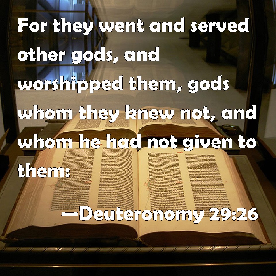 Choose a Background Deuteronomy 29:26 For they went and served other gods, and worshipped them, gods whom they knew not, and whom he had not given to them: KJV: For they went and served other gods, and worshipped them, gods whom they knew not, and whom he had not given unto them: DRB: And they have served strange gods, and adored them, whom they knew not, and for whom they had not been assigned: DBT: and they went and served other gods, and bowed down to them, gods whom they knew not, and whom he had not assigned to them. ERV: and went and served other gods, and worshipped them, gods whom they knew not, and whom he had not given unto them: WBT: For they went and served other gods, and worshiped them, gods which they knew not, and which he had not given to them: WEB: and went and served other gods, and worshiped them, gods that they didn't know, and that he had not given to them: YLT: and they go and serve other gods, and bow themselves to them — gods which they have not known, and which He hath not apportioned to them;Links Deuteronomy 29:26 NIV • Deuteronomy 29:26 NLT • Deuteronomy 29:26 ESV • Deuteronomy 29:26 NASB • Deuteronomy 29:26 KJV • Deuteronomy 29:26 Interlinear • Deuteronomy 29:26 Commentaries • Deuteronomy 29:26 Parallel Texts • Deuteronomy 29:26 Bible Apps • Deuteronomy 29:26 Parallel • Bible Hub |