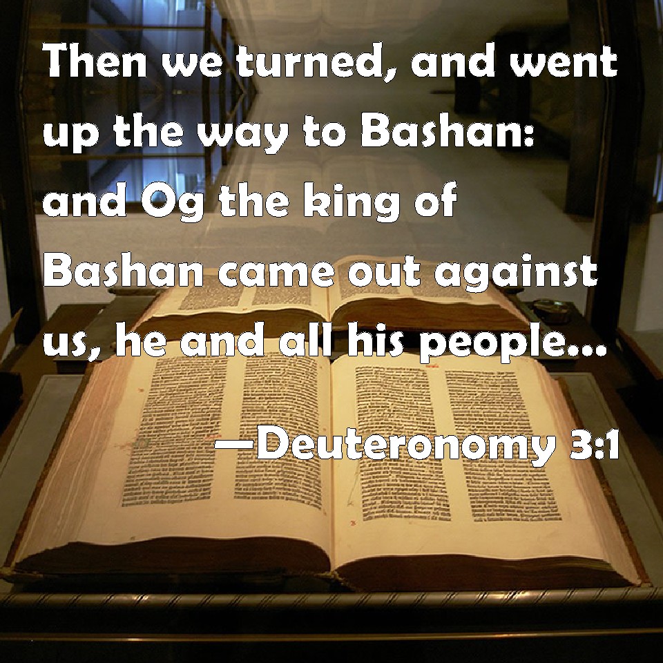 Choose a Background Deuteronomy 3:1 Then we turned, and went up the way to Bashan: and Og the king of Bashan came out against us, he and all his people, to battle at Edrei. KJV: Then we turned, and went up the way to Bashan: and Og the king of Bashan came out against us, he and all his people, to battle at Edrei. DRB: Then we turned and went by the way of Basan: and Og the king of Basan came out to meet us with his people to fight in Edrai. DBT: And we turned, and went up the way to Bashan; and Og the king of Bashan came out against us, he and all his people, for battle at Edrei. ERV: Then we turned, and went up the way to Bashan: and Og the king of Bashan came out against us, he and all his people, unto battle at Edrei. WBT: Then we turned, and went up the way to Bashan: and Og the king of Bashan came out against us, he and all his people, to battle at Edrei. WEB: Then we turned, and went up the way to Bashan: and Og the king of Bashan came out against us, he and all his people, to battle at Edrei. YLT: And we turn, and go up the way to Bashan, and Og king of Bashan cometh out to meet us, he and all his people, to battle, to Edrei.Links Deuteronomy 3:1 NIV • Deuteronomy 3:1 NLT • Deuteronomy 3:1 ESV • Deuteronomy 3:1 NASB • Deuteronomy 3:1 KJV • Deuteronomy 3:1 Interlinear • Deuteronomy 3:1 Commentaries • Deuteronomy 3:1 Parallel Texts • Deuteronomy 3:1 Bible Apps • Deuteronomy 3:1 Parallel • Bible Hub |