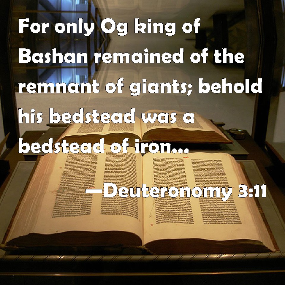 Choose a Background Deuteronomy 3:11 For only Og king of Bashan remained of the remnant of giants; behold his bedstead was a bedstead of iron; is it not in Rabbath of the children of Ammon? nine cubits was the length thereof, and four cubits the breadth of it, after the cubit of a man. KJV: For only Og king of Bashan remained of the remnant of giants; behold, his bedstead was a bedstead of iron; is it not in Rabbath of the children of Ammon? nine cubits was the length thereof, and four cubits the breadth of it, after the cubit of a man. DRB: For only Og king of Basan remained of the race of the giants. His bed of iron is shewn, which is in Rabbath of the children of Ammon, being nine cubits long, and four broad after the measure of the cubit of a man's hand. DBT: For only Og the king of Bashan remained of the residue of giants: behold, his bedstead was a bedstead of iron; is it not in Rabbah of the children of Ammon? its length was nine cubits, and its breadth four cubits, after the cubit of a man. ERV: (For only Og king of Bashan remained of the remnant of the Rephaim; behold, his bedstead was a bedstead of iron; is it not in Rabbah of the children of Ammon? nine cubits was the length thereof, and four cubits the breadth of it, after the cubit of a man.) WBT: For only Og king of Bashan remained of the remnant of giants; behold, his bedstead was a bedstead of iron; is it not in Rabbath of the children of Ammon? nine cubits was the length of it, and four cubits the breadth of it, after the cubit of a man. WEB: (For only Og king of Bashan remained of the remnant of the Rephaim; behold, his bedstead was a bedstead of iron; isn't it in Rabbah of the children of Ammon? nine cubits was its length, and four cubits its breadth, after the cubit of a man.) YLT: for only Og king of Bashan had been left of the remnant of the Rephaim; lo, his bedstead is a bedstead of iron; is it not in Rabbath of the sons of Ammon? nine cubits its length, and four cubits its breadth, by the cubit of a man.Links Deuteronomy 3:11 NIV • Deuteronomy 3:11 NLT • Deuteronomy 3:11 ESV • Deuteronomy 3:11 NASB • Deuteronomy 3:11 KJV • Deuteronomy 3:11 Interlinear • Deuteronomy 3:11 Commentaries • Deuteronomy 3:11 Parallel Texts • Deuteronomy 3:11 Bible Apps • Deuteronomy 3:11 Parallel • Bible Hub |