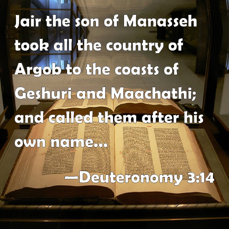 Choose a Background Deuteronomy 3:14 Jair the son of Manasseh took all the country of Argob to the coasts of Geshuri and Maachathi; and called them after his own name, Bashanhavothjair, to this day. KJV: Jair the son of Manasseh took all the country of Argob unto the coasts of Geshuri and Maachathi; and called them after his own name, Bashanhavothjair, unto this day. DRB: Jair the son of Manasses possessed all the country of d Argob unto the borders of Gessuri, and Machati. And he called Basan by his own name, Havoth Jair, that is to say, the towns of Jair, until this present day. DBT: Jair the son of Manasseh took the whole region of Argob as far as the border of the Geshurites and Maachathites, and called Bashan after his own name, Havoth-Jair, to this day.) ERV: Jair the son of Manasseh took all the region of Argob, unto the border of the Geshurites and the Maacathites; and called them, even Bashan, after his own name, Havvoth-jair, unto this day.) WBT: Jair the son of Manasseh took all the country of Argob, to the borders of Geshuri, and Maachathi; and called them after his own name, Bashan-havoth-jair, to this day. WEB: Jair the son of Manasseh took all the region of Argob, to the border of the Geshurites and the Maacathites, and called them, even Bashan, after his own name, Havvoth Jair, to this day.) YLT: 'Jair son of Manasseh hath taken all the region of Argob, unto the border of Geshuri, and Maachathi, and calleth them by his own name, Bashan-Havoth-Jair, unto this day.Links Deuteronomy 3:14 NIV • Deuteronomy 3:14 NLT • Deuteronomy 3:14 ESV • Deuteronomy 3:14 NASB • Deuteronomy 3:14 KJV • Deuteronomy 3:14 Interlinear • Deuteronomy 3:14 Commentaries • Deuteronomy 3:14 Parallel Texts • Deuteronomy 3:14 Bible Apps • Deuteronomy 3:14 Parallel • Bible Hub |