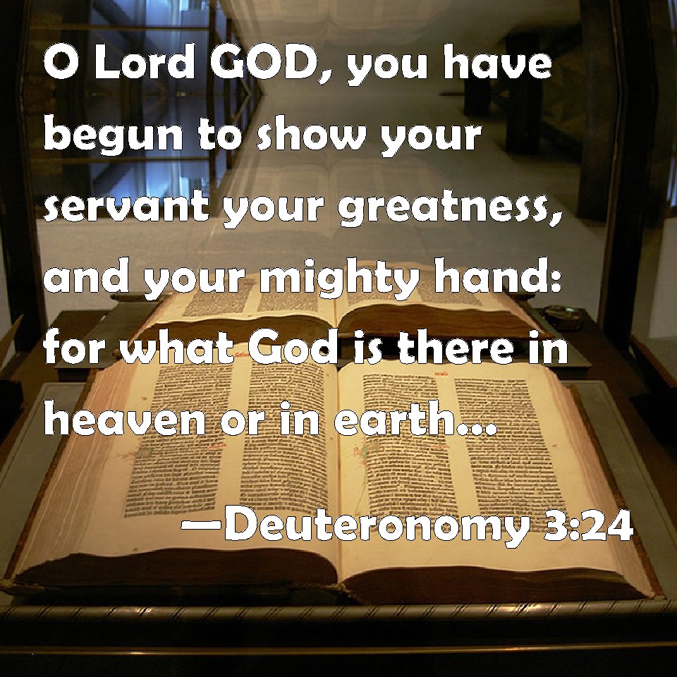 Choose a Background Deuteronomy 3:24 O Lord GOD, you have begun to show your servant your greatness, and your mighty hand: for what God is there in heaven or in earth, that can do according to your works, and according to your might? KJV: O Lord GOD, thou hast begun to shew thy servant thy greatness, and thy mighty hand: for what God is there in heaven or in earth, that can do according to thy works, and according to thy might? DRB: Lord God, thou hast begun to shew unto thy servant thy greatness, and most mighty hand, for there is no other God either in heaven or earth, that is able to do thy works, or to be compared to thy strength. DBT: Lord Jehovah, thou hast begun to shew thy servant thy greatness, and thy powerful hand; for what God is in the heavens or in the earth that can do like to thy works, and like to thy might? ERV: O Lord GOD, thou hast begun to shew thy servant thy greatness, and thy strong hand: for what god is there in heaven or in earth, that can do according to thy works, and according to thy mighty acts? WBT: O Lord GOD, thou hast begun to show thy servant thy greatness, and thy mighty hand: for what God is there in heaven or in earth, that can do according to thy works, and according to thy might? WEB: "Lord Yahweh, you have begun to show your servant your greatness, and your strong hand: for what god is there in heaven or in earth, that can do according to your works, and according to your mighty acts? YLT: Lord Jehovah, Thou — Thou hast begun to shew Thy servant Thy greatness, and Thy strong hand; for who is a God in the heavens or in earth who doth according to Thy works, and according to Thy might?Links Deuteronomy 3:24 NIV • Deuteronomy 3:24 NLT • Deuteronomy 3:24 ESV • Deuteronomy 3:24 NASB • Deuteronomy 3:24 KJV • Deuteronomy 3:24 Interlinear • Deuteronomy 3:24 Commentaries • Deuteronomy 3:24 Parallel Texts • Deuteronomy 3:24 Bible Apps • Deuteronomy 3:24 Parallel • Bible Hub |