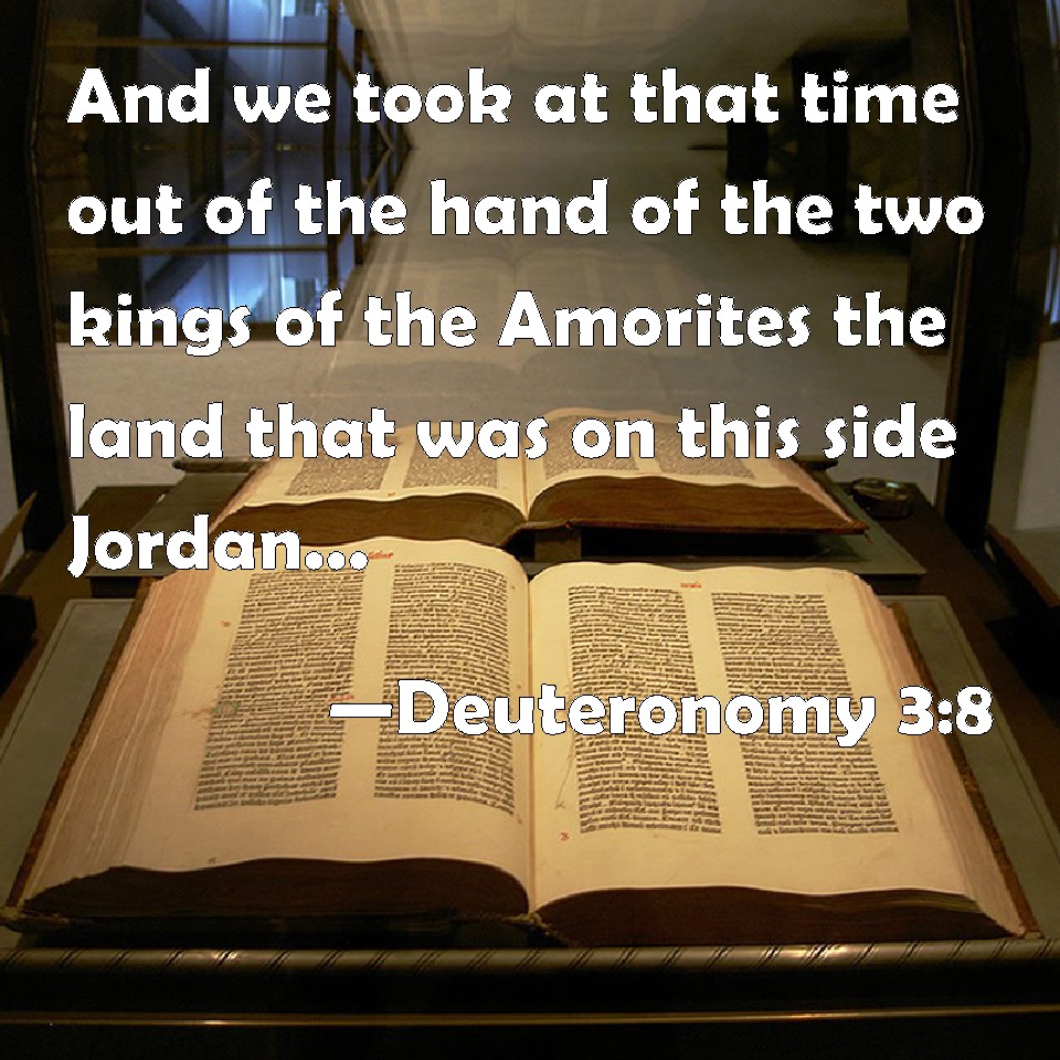 Choose a Background Deuteronomy 3:8 And we took at that time out of the hand of the two kings of the Amorites the land that was on this side Jordan, from the river of Arnon to mount Hermon; KJV: And we took at that time out of the hand of the two kings of the Amorites the land that was on this side Jordan, from the river of Arnon unto mount Hermon; DRB: And we took at that time the land out of the hand of the two kings of the Amorrhites, that were beyond the Jordan: from the torrent Amen unto the mount Hermon, DBT: And we took at that time the land out of the hand of the two kings of the Amorites, that were on this side the Jordan, from the river Arnon to mount Hermon ERV: And we took the land at that time out of the hand of the two kings of the Amorites that were beyond Jordan, from the valley of Arnon unto mount Hermon; WBT: And we took at that time out of the hand of the two kings of the Amorites the land that was on this side of Jordan, from the river of Arnon to mount Hermon; WEB: We took the land at that time out of the hand of the two kings of the Amorites who were beyond the Jordan, from the valley of the Arnon to Mount Hermon; YLT: 'And we take, at that time, the land out of the hand of the two kings of the Amorite, which is beyond the Jordan, from the brook Arnon unto mount Hermon;Links Deuteronomy 3:8 NIV • Deuteronomy 3:8 NLT • Deuteronomy 3:8 ESV • Deuteronomy 3:8 NASB • Deuteronomy 3:8 KJV • Deuteronomy 3:8 Interlinear • Deuteronomy 3:8 Commentaries • Deuteronomy 3:8 Parallel Texts • Deuteronomy 3:8 Bible Apps • Deuteronomy 3:8 Parallel • Bible Hub |