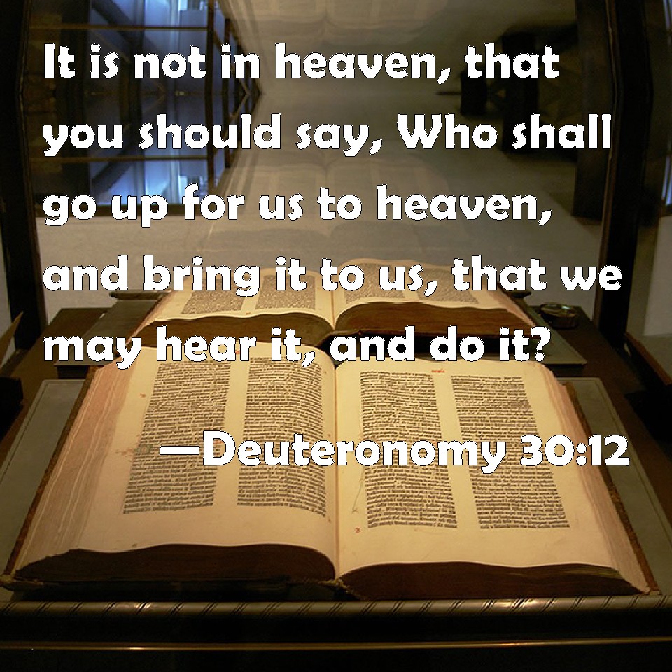 Choose a Background Deuteronomy 30:12 It is not in heaven, that you should say, Who shall go up for us to heaven, and bring it to us, that we may hear it, and do it? KJV: It is not in heaven, that thou shouldest say, Who shall go up for us to heaven, and bring it unto us, that we may hear it, and do it? DRB: Nor is it in heaven, that thou shouldst say: Which of us can go up to heaven to bring it unto us, and we may hear and fulfil it in work? DBT: It is not in the heavens, that thou shouldest say, Who shall go up for us to the heavens, and bring it to us, that we should hear it and do it? ERV: It is not in heaven, that thou shouldest say, Who shall go up for us to heaven, and bring it unto us, and make us to hear it, that we may do it? WBT: It is not in heaven, that thou shouldst say, Who shall ascend for us to heaven, and bring it to us, that we may hear it, and do it? WEB: It is not in heaven, that you should say, "Who shall go up for us to heaven, and bring it to us, and make us to hear it, that we may do it?" YLT: It is not in the heavens, — saying, Who doth go up for us into the heavens, and doth take it for us, and doth cause us to hear it — that we may do it.Links Deuteronomy 30:12 NIV • Deuteronomy 30:12 NLT • Deuteronomy 30:12 ESV • Deuteronomy 30:12 NASB • Deuteronomy 30:12 KJV • Deuteronomy 30:12 Interlinear • Deuteronomy 30:12 Commentaries • Deuteronomy 30:12 Parallel Texts • Deuteronomy 30:12 Bible Apps • Deuteronomy 30:12 Parallel • Bible Hub |