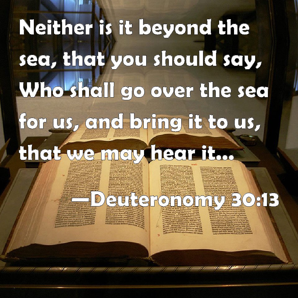 Choose a Background Deuteronomy 30:13 Neither is it beyond the sea, that you should say, Who shall go over the sea for us, and bring it to us, that we may hear it, and do it? KJV: Neither is it beyond the sea, that thou shouldest say, Who shall go over the sea for us, and bring it unto us, that we may hear it, and do it? DRB: Nor is it beyond the sea: that thou mayst excuse thyself, and say: Which of us can cross the sea, and bring it unto us: that we may hear, and do that which is commanded? DBT: And it is not beyond the sea, that thou shouldest say, Who shall go over the sea for us, and bring it to us, that we should hear it and do it? ERV: Neither is it beyond the sea, that thou shouldest say, Who shall go over the sea for us, and bring it unto us, and make us to hear it, that we may do it? WBT: Neither is it beyond the sea, that thou shouldst say, Who shall go over the sea for us, and bring it to us, that we may hear it, and do it? WEB: Neither is it beyond the sea, that you should say, "Who shall go over the sea for us, and bring it to us, and make us to hear it, that we may do it?" YLT: And it is not beyond the sea, — saying, Who doth pass over for us beyond the sea, and doth take it for us, and doth cause us to hear it — that we may do it?Links Deuteronomy 30:13 NIV • Deuteronomy 30:13 NLT • Deuteronomy 30:13 ESV • Deuteronomy 30:13 NASB • Deuteronomy 30:13 KJV • Deuteronomy 30:13 Interlinear • Deuteronomy 30:13 Commentaries • Deuteronomy 30:13 Parallel Texts • Deuteronomy 30:13 Bible Apps • Deuteronomy 30:13 Parallel • Bible Hub |