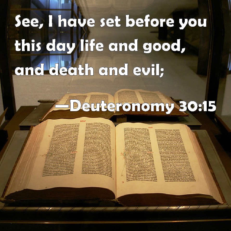 Choose a Background Deuteronomy 30:15 See, I have set before you this day life and good, and death and evil; KJV: See, I have set before thee this day life and good, and death and evil; DRB: Consider that I have set before thee this day life and good, and on the other hand death and evil: DBT: See, I have set before thee this day life and good, and death and evil, ERV: See, I have set before thee this day life and good, and death and evil; WBT: See, I have set before thee this day life and good, and death and evil; WEB: Behold, I have set before you this day life and good, and death and evil; YLT: 'See, I have set before thee to-day life and good, and death and evil,Links Deuteronomy 30:15 NIV • Deuteronomy 30:15 NLT • Deuteronomy 30:15 ESV • Deuteronomy 30:15 NASB • Deuteronomy 30:15 KJV • Deuteronomy 30:15 Interlinear • Deuteronomy 30:15 Commentaries • Deuteronomy 30:15 Parallel Texts • Deuteronomy 30:15 Bible Apps • Deuteronomy 30:15 Parallel • Bible Hub |