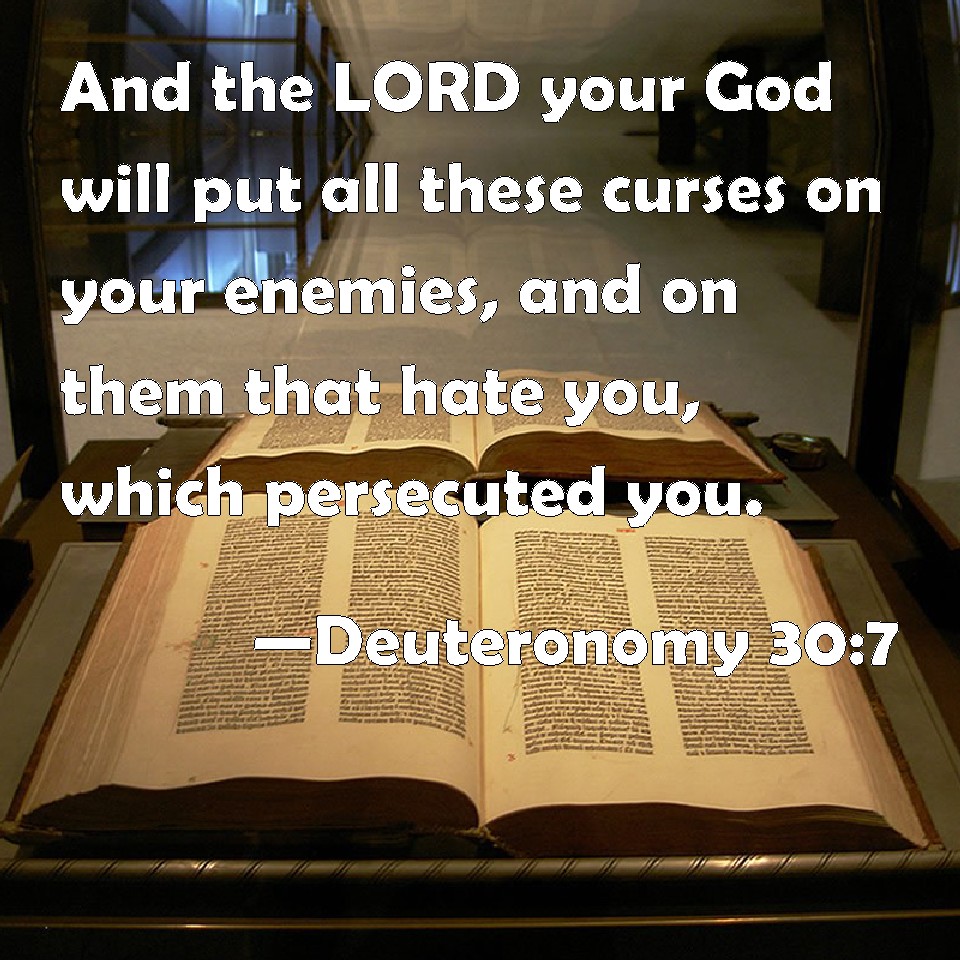 Choose a Background Deuteronomy 30:7 And the LORD your God will put all these curses on your enemies, and on them that hate you, which persecuted you. KJV: And the LORD thy God will put all these curses upon thine enemies, and on them that hate thee, which persecuted thee. DRB: And he will turn all these curses upon thy enemies, and upon them that hate and persecute thee. DBT: And Jehovah thy God will put all these curses on thine enemies, and on them that hate thee, who have persecuted thee. ERV: And the LORD thy God will put all these curses upon thine enemies, and on them that hate thee, which persecuted thee. WBT: And the LORD thy God will put all these curses upon thy enemies, and on them that hate thee, who persecuted thee. WEB: Yahweh your God will put all these curses on your enemies, and on those who hate you, who persecuted you. YLT: and Jehovah thy God hath put all this oath on thine enemies, and on those hating thee, who have pursued thee.Links Deuteronomy 30:7 NIV • Deuteronomy 30:7 NLT • Deuteronomy 30:7 ESV • Deuteronomy 30:7 NASB • Deuteronomy 30:7 KJV • Deuteronomy 30:7 Interlinear • Deuteronomy 30:7 Commentaries • Deuteronomy 30:7 Parallel Texts • Deuteronomy 30:7 Bible Apps • Deuteronomy 30:7 Parallel • Bible Hub |