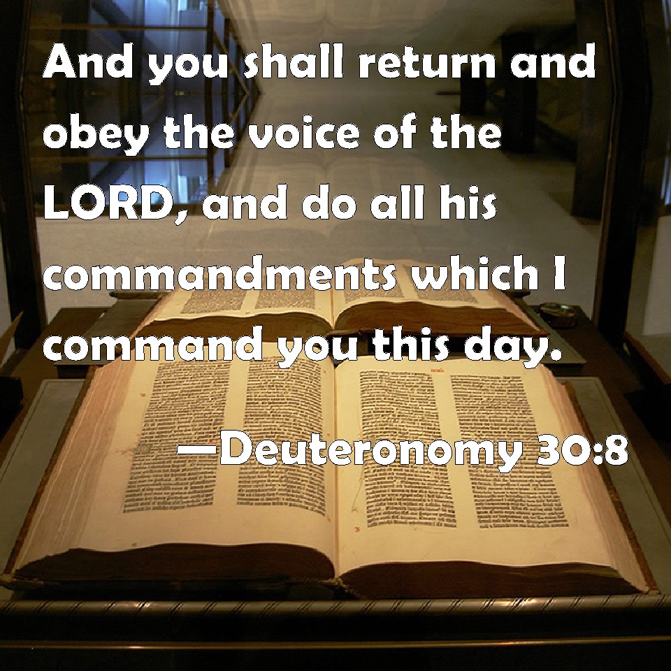 Choose a Background Deuteronomy 30:8 And you shall return and obey the voice of the LORD, and do all his commandments which I command you this day. KJV: And thou shalt return and obey the voice of the LORD, and do all his commandments which I command thee this day. DRB: But thou shalt return, and hear the voice of the Lord thy God, and shalt do all the commandments which I command thee this day: DBT: But thou shalt return and hearken to the voice of Jehovah, and do all his commandments which I command thee this day. ERV: And thou shalt return and obey the voice of the LORD, and do all his commandments which I command thee this day. WBT: And thou shalt return and obey the voice of the LORD, and do all his commandments which I command thee this day. WEB: You shall return and obey the voice of Yahweh, and do all his commandments which I command you this day. YLT: 'And thou dost turn back, and hast hearkened to the voice of Jehovah, and hast done all His commands which I am commanding thee to-day;Links Deuteronomy 30:8 NIV • Deuteronomy 30:8 NLT • Deuteronomy 30:8 ESV • Deuteronomy 30:8 NASB • Deuteronomy 30:8 KJV • Deuteronomy 30:8 Interlinear • Deuteronomy 30:8 Commentaries • Deuteronomy 30:8 Parallel Texts • Deuteronomy 30:8 Bible Apps • Deuteronomy 30:8 Parallel • Bible Hub |