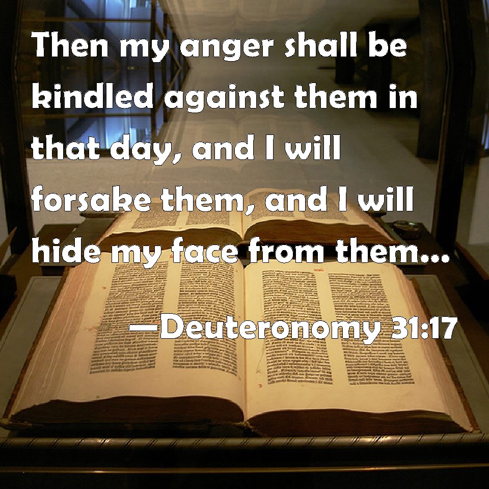 Choose a Background Deuteronomy 31:17 Then my anger shall be kindled against them in that day, and I will forsake them, and I will hide my face from them, and they shall be devoured, and many evils and troubles shall befall them; so that they will say in that day, Are not these evils come on us, because our God is not among us? KJV: Then my anger shall be kindled against them in that day, and I will forsake them, and I will hide my face from them, and they shall be devoured, and many evils and troubles shall befall them; so that they will say in that day, Are not these evils come upon us, because our God is not among us? DRB: And my wrath shall be kindled against them in that day: and I will forsake them, and will hide my face from them, and they shall be devoured: all evils and afflictions shall find them, so that they shall say in that day: In truth it is because God is not with me, that these evils have found me. DBT: And my anger shall be kindled against them in that day, and I will forsake them, and I will hide my face from them, and they shall be devoured, and many evils and troubles shall befall them, and they will say in that day, Have not these evils befallen me because my God is not in my midst? ERV: Then my anger shall be kindled against them in that day, and I will forsake them, and I will hide my face from them, and they shall be devoured, and many evils and troubles shall come upon them; so that they will say in that day, Are not these evils come upon us because our God is not among us? WBT: Then my anger shall be kindled against them in that day, and I will forsake them, and I will hide my face from them, and they shall be devoured, and many evils and troubles shall befall them, so that they will say in that day, Have not these evils come upon us, because our God is not among us? WEB: Then my anger shall be kindled against them in that day, and I will forsake them, and I will hide my face from them, and they shall be devoured, and many evils and troubles shall come on them; so that they will say in that day, 'Haven't these evils come on us because our God is not among us?' YLT: and Mine anger hath burned against it in that day, and I have forsaken them, and hidden My face from them, and it hath been for consumption, and many evils and distresses have found it, and it hath said in that day, Is it not because that my God is not in my midst — these evils have found me?Links Deuteronomy 31:17 NIV • Deuteronomy 31:17 NLT • Deuteronomy 31:17 ESV • Deuteronomy 31:17 NASB • Deuteronomy 31:17 KJV • Deuteronomy 31:17 Interlinear • Deuteronomy 31:17 Commentaries • Deuteronomy 31:17 Parallel Texts • Deuteronomy 31:17 Bible Apps • Deuteronomy 31:17 Parallel • Bible Hub |