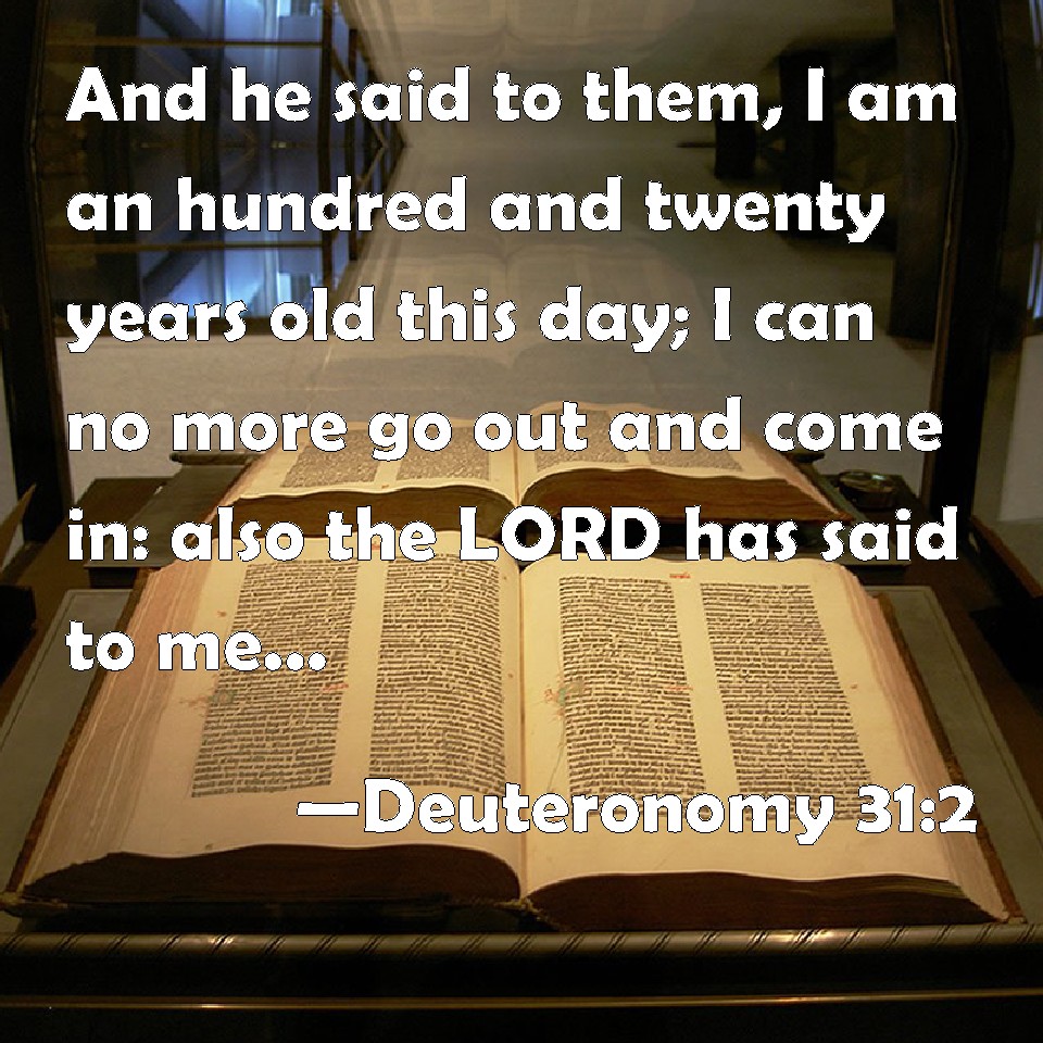 Choose a Background Deuteronomy 31:2 And he said to them, I am an hundred and twenty years old this day; I can no more go out and come in: also the LORD has said to me, You shall not go over this Jordan. KJV: And he said unto them, I am an hundred and twenty years old this day; I can no more go out and come in: also the LORD hath said unto me, Thou shalt not go over this Jordan. DRB: And he said to them: I am this day a hundred and twenty years old, I can no longer go out and come in, especially as the Lord also hath said to me: Thou shalt not pass over this Jordan. DBT: and he said unto them, I am a hundred and twenty years old this day, I can no more go out and come in; and Jehovah hath said unto me, Thou shalt not go over this Jordan. ERV: And he said unto them, I am an hundred and twenty years old this day; I can no more go out and come in: and the LORD hath said unto me, Thou shalt not go over this Jordan. WBT: And he said to them, I am a hundred and twenty years old this day; I can no more go out and come in: also the LORD hath said to me, thou shalt not go over this Jordan. WEB: He said to them, "I am one hundred twenty years old this day; I can no more go out and come in: and Yahweh has said to me, 'You shall not go over this Jordan.' YLT: and he saith unto them, 'A son of a hundred and twenty years am I to-day; I am not able any more to go out and to come in, and Jehovah hath said unto me, Thou dost not pass over this Jordan,Links Deuteronomy 31:2 NIV • Deuteronomy 31:2 NLT • Deuteronomy 31:2 ESV • Deuteronomy 31:2 NASB • Deuteronomy 31:2 KJV • Deuteronomy 31:2 Interlinear • Deuteronomy 31:2 Commentaries • Deuteronomy 31:2 Parallel Texts • Deuteronomy 31:2 Bible Apps • Deuteronomy 31:2 Parallel • Bible Hub |