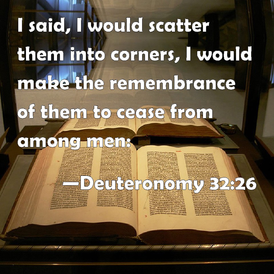 Choose a Background Deuteronomy 32:26 I said, I would scatter them into corners, I would make the remembrance of them to cease from among men: KJV: I said, I would scatter them into corners, I would make the remembrance of them to cease from among men: DRB: I said: Where are they? I will make the memory of them to cease from among men. DBT: I would say, I will scatter, I will make the remembrance of them to cease from among men, ERV: I said, I would scatter them afar, I would make the remembrance of them to cease from among men: WBT: I said, I would scatter them into corners, I would make the remembrance of them to cease from among men; WEB: I said, I would scatter them afar. I would make the memory of them to cease from among men; YLT: I have said: I blow them away, I cause their remembrance to cease from man;Links Deuteronomy 32:26 NIV • Deuteronomy 32:26 NLT • Deuteronomy 32:26 ESV • Deuteronomy 32:26 NASB • Deuteronomy 32:26 KJV • Deuteronomy 32:26 Interlinear • Deuteronomy 32:26 Commentaries • Deuteronomy 32:26 Parallel Texts • Deuteronomy 32:26 Bible Apps • Deuteronomy 32:26 Parallel • Bible Hub |