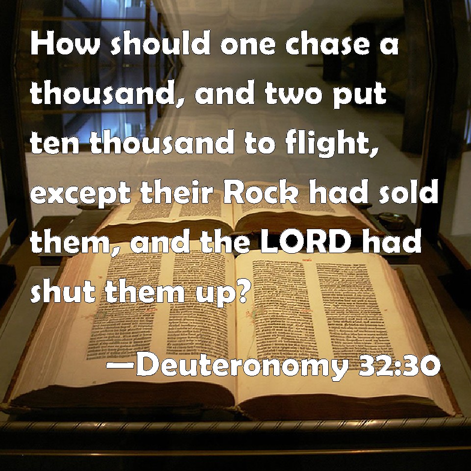 Choose a Background Deuteronomy 32:30 How should one chase a thousand, and two put ten thousand to flight, except their Rock had sold them, and the LORD had shut them up? KJV: How should one chase a thousand, and two put ten thousand to flight, except their Rock had sold them, and the LORD had shut them up? DRB: How should one pursue after a thousand, and two chase ten thousand? Was it not, because their God had sold them, and the Lord had shut them up? DBT: How could one chase a thousand, And two put ten thousand to flight, Were it not that their Rock had sold them, And Jehovah had delivered them up? ERV: How should one chase a thousand, And two put ten thousand to flight, Except their Rock had sold them, And the LORD had delivered them up? WBT: How should one chase a thousand, and two put ten thousand to flight, except their Rock had sold them, and the LORD had shut them up? WEB: How could one chase a thousand, and two put ten thousand to flight, unless their Rock had sold them, and Yahweh had delivered them up? YLT: How doth one pursue a thousand, And two cause a myriad to flee! If not — that their rock hath sold them, And Jehovah hath shut them up?Links Deuteronomy 32:30 NIV • Deuteronomy 32:30 NLT • Deuteronomy 32:30 ESV • Deuteronomy 32:30 NASB • Deuteronomy 32:30 KJV • Deuteronomy 32:30 Interlinear • Deuteronomy 32:30 Commentaries • Deuteronomy 32:30 Parallel Texts • Deuteronomy 32:30 Bible Apps • Deuteronomy 32:30 Parallel • Bible Hub |