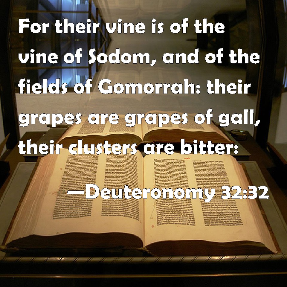 Choose a Background Deuteronomy 32:32 For their vine is of the vine of Sodom, and of the fields of Gomorrah: their grapes are grapes of gall, their clusters are bitter: KJV: For their vine is of the vine of Sodom, and of the fields of Gomorrah: their grapes are grapes of gall, their clusters are bitter: DRB: Their vines are of the vineyard of Sodom, and of the suburbs of Gomorrha: their grapes are grapes of gall, and their clusters most bitter. DBT: For their vine is of the vine of Sodom, And of the fields of Gomorrah: Their grapes are grapes of poison, Bitter are their clusters; ERV: For their vine is of the vine of Sodom, And of the fields of Gomorrah: Their grapes are grapes of gall, Their clusters are bitter: WBT: For their vine is of the vine of Sodom, and of the fields of Gomorrah: their grapes are grapes of gall, their clusters are bitter: WEB: For their vine is of the vine of Sodom, of the fields of Gomorrah. Their grapes are grapes of gall, Their clusters are bitter. YLT: For of the vine of Sodom their vine is, And of the fields of Gomorrah; Their grapes are grapes of gall — They have bitter clusters;Links Deuteronomy 32:32 NIV • Deuteronomy 32:32 NLT • Deuteronomy 32:32 ESV • Deuteronomy 32:32 NASB • Deuteronomy 32:32 KJV • Deuteronomy 32:32 Interlinear • Deuteronomy 32:32 Commentaries • Deuteronomy 32:32 Parallel Texts • Deuteronomy 32:32 Bible Apps • Deuteronomy 32:32 Parallel • Bible Hub |