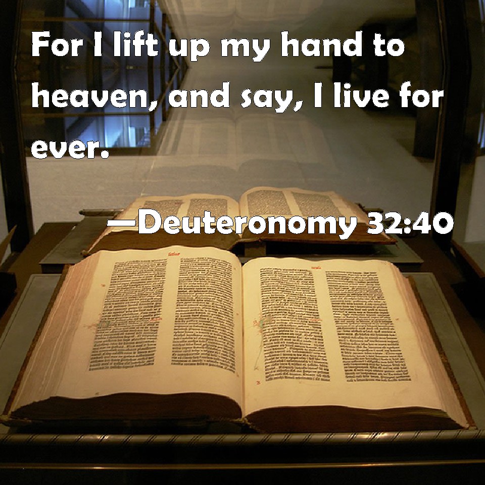 Choose a Background Deuteronomy 32:40 For I lift up my hand to heaven, and say, I live for ever. KJV: For I lift up my hand to heaven, and say, I live for ever. DRB: I will lift up my hand to heaven, and I will say: I live for ever. DBT: For I lift up my hand to the heavens, and say, I live for ever! ERV: For I lift up my hand to heaven, And say, As I live for ever, WBT: For I lift up my hand to heaven, and say, I live for ever. WEB: For I lift up my hand to heaven, And say, As I live forever, YLT: For I lift up unto the heavens My hand, And have said, I live — to the age!Links Deuteronomy 32:40 NIV • Deuteronomy 32:40 NLT • Deuteronomy 32:40 ESV • Deuteronomy 32:40 NASB • Deuteronomy 32:40 KJV • Deuteronomy 32:40 Interlinear • Deuteronomy 32:40 Commentaries • Deuteronomy 32:40 Parallel Texts • Deuteronomy 32:40 Bible Apps • Deuteronomy 32:40 Parallel • Bible Hub |