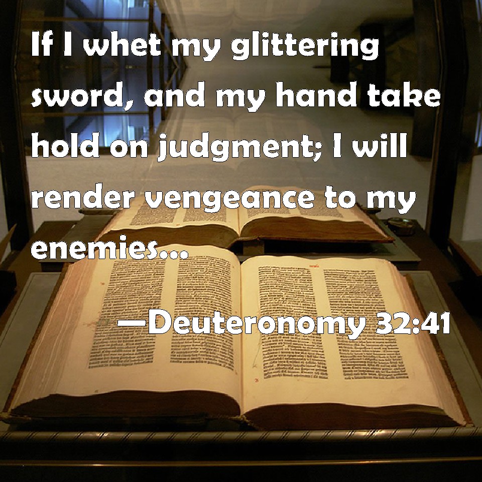 Choose a Background Deuteronomy 32:41 If I whet my glittering sword, and my hand take hold on judgment; I will render vengeance to my enemies, and will reward them that hate me. KJV: If I whet my glittering sword, and mine hand take hold on judgment; I will render vengeance to mine enemies, and will reward them that hate me. DRB: If I shall whet my sword as the lightning, and my hand take hold on judgment: I will render vengeance to my enemies, and repay them that hate me. DBT: If I have sharpened my gleaming sword, And my hand take hold of judgment, I will render vengeance to mine adversaries, And will recompense them that hate me. ERV: If I whet my glittering sword, And mine hand take hold on judgment; I will render vengeance to mine adversaries, And will recompense them that hate me. WBT: If I shall whet my glittering sword, and my hand take hold on judgment; I will render vengeance to my enemies, and will reward them that hate me. WEB: if I whet my glittering sword, My hand take hold on judgment; I will render vengeance to my adversaries, and will recompense those who hate me. YLT: If I have sharpened the brightness of My sword, And My hand doth lay hold on judgment, I turn back vengeance to Mine adversaries, And to those hating Me — I repay!Links Deuteronomy 32:41 NIV • Deuteronomy 32:41 NLT • Deuteronomy 32:41 ESV • Deuteronomy 32:41 NASB • Deuteronomy 32:41 KJV • Deuteronomy 32:41 Interlinear • Deuteronomy 32:41 Commentaries • Deuteronomy 32:41 Parallel Texts • Deuteronomy 32:41 Bible Apps • Deuteronomy 32:41 Parallel • Bible Hub |