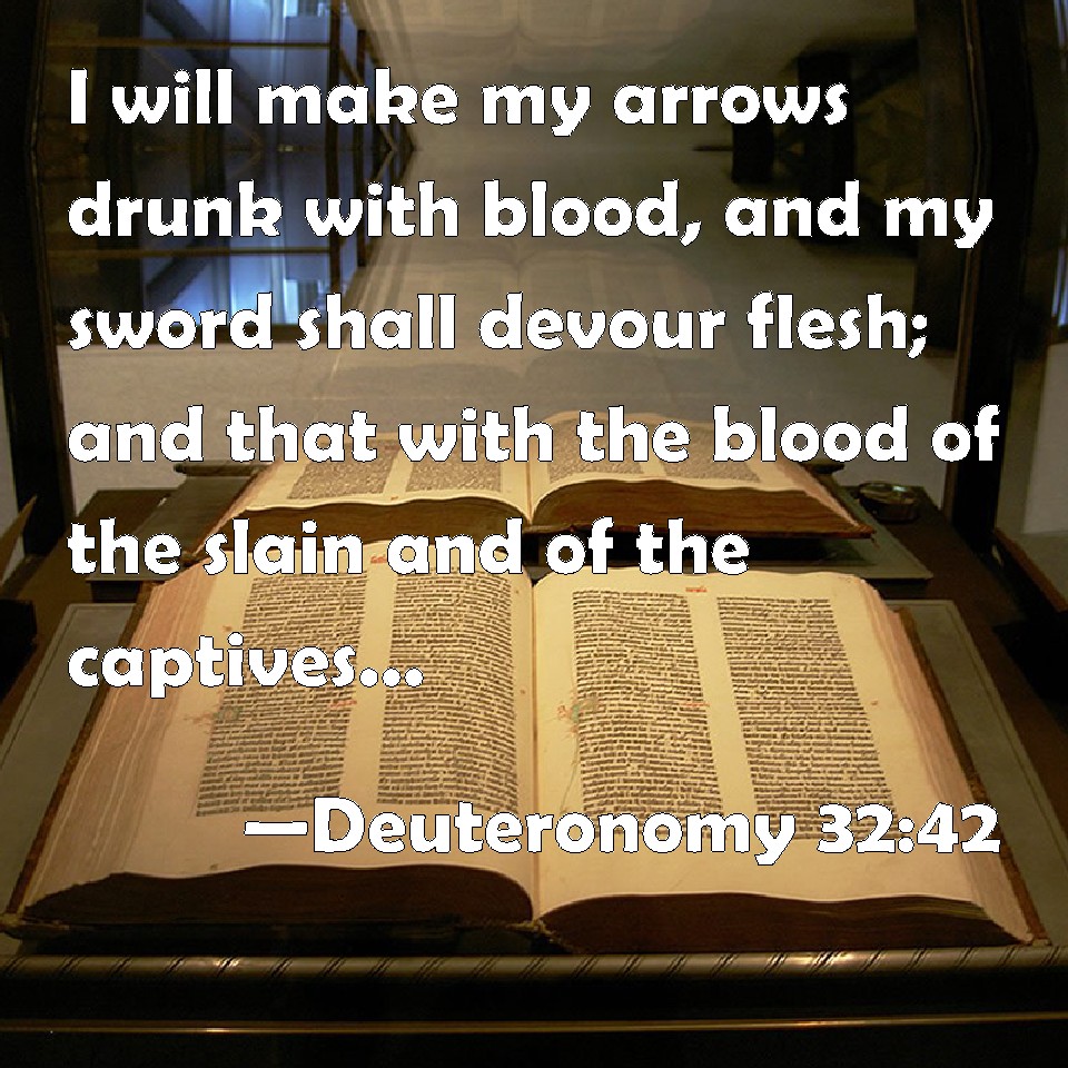Choose a Background Deuteronomy 32:42 I will make my arrows drunk with blood, and my sword shall devour flesh; and that with the blood of the slain and of the captives, from the beginning of revenges on the enemy. KJV: I will make mine arrows drunk with blood, and my sword shall devour flesh; and that with the blood of the slain and of the captives, from the beginning of revenges upon the enemy. DRB: I will make my arrows drunk with blood, and my sword shall devour flesh, of the blood of the slain and of the captivity, of the bare head of the enemies. DBT: Mine arrows will I make drunk with blood, And my sword shall devour flesh; I will make them drunk with the blood of the slain and of the captives, With the head of the princes of the enemy. ERV: I will make mine arrows drunk with blood, And my sword shall devour flesh; With the blood of the slain and the captives, From the head of the leaders of the enemy. WBT: I will make my arrows drunk with blood, and my sword shall devour flesh; and that with the blood of the slain and of the captives from the beginning of revenges upon the enemy. WEB: I will make my arrows drunk with blood. My sword shall devour flesh with the blood of the slain and the captives, from the head of the leaders of the enemy." YLT: I make drunk Mine arrows with blood, And My sword devoureth flesh, From the blood of the pierced and captive, From the head of the freemen of the enemy.Links Deuteronomy 32:42 NIV • Deuteronomy 32:42 NLT • Deuteronomy 32:42 ESV • Deuteronomy 32:42 NASB • Deuteronomy 32:42 KJV • Deuteronomy 32:42 Interlinear • Deuteronomy 32:42 Commentaries • Deuteronomy 32:42 Parallel Texts • Deuteronomy 32:42 Bible Apps • Deuteronomy 32:42 Parallel • Bible Hub |