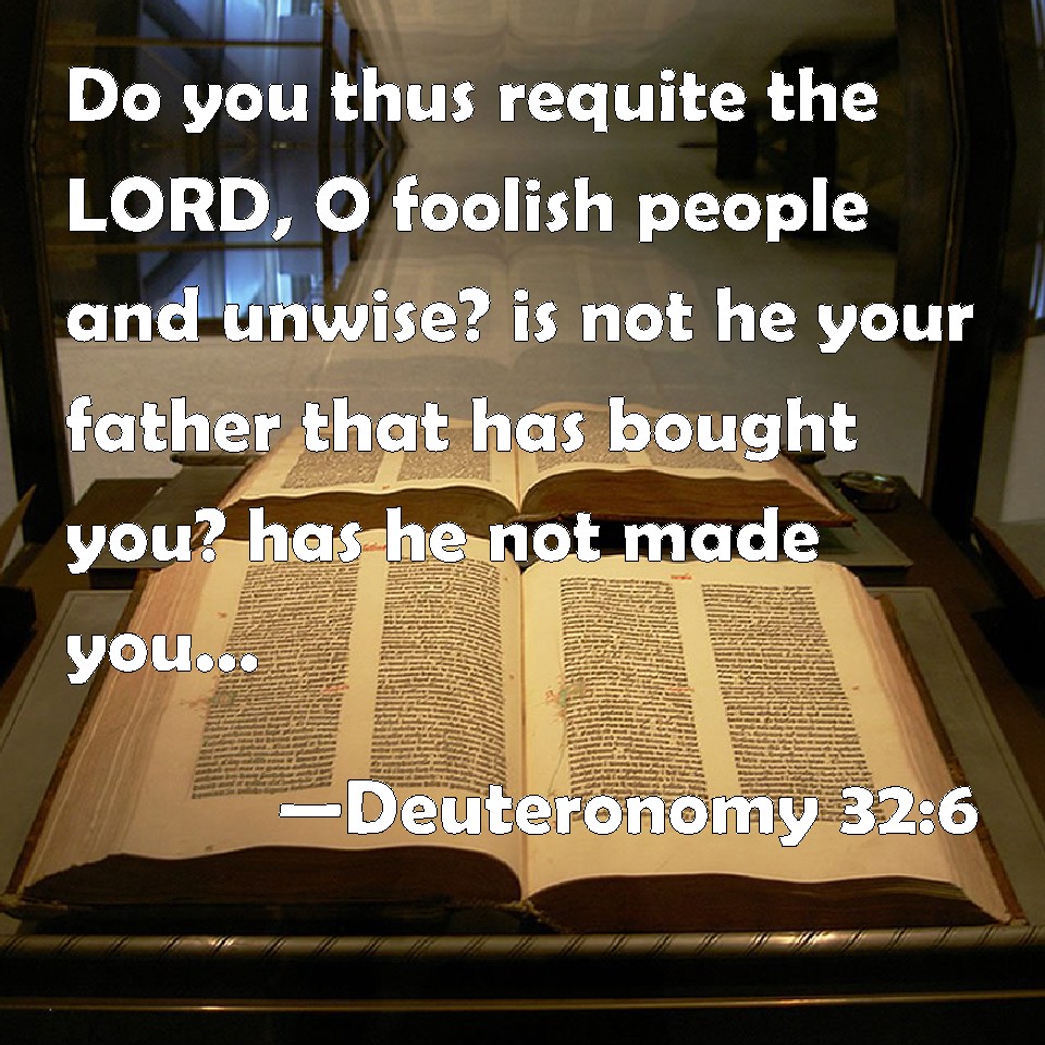 Choose a Background Deuteronomy 32:6 Do you thus requite the LORD, O foolish people and unwise? is not he your father that has bought you? has he not made you, and established you? KJV: Do ye thus requite the LORD, O foolish people and unwise? is not he thy father that hath bought thee? hath he not made thee, and established thee? DRB: Is this the return thou makest to the Lord, O foolish and senseless people? Is not he thy father, that hath possessed thee, and made thee, and created thee? DBT: Do ye thus requite Jehovah, Foolish and unwise people? Is not he thy father that hath bought thee? Hath he not made thee and established thee? ERV: Do ye thus requite the LORD, O foolish people and unwise? Is not he thy father that hath bought thee? He hath made thee, and established thee. WBT: Do ye thus requite the LORD, O foolish people and unwise? is not he thy father that hath bought thee? hath he not made thee, and established thee? WEB: Do you thus requite Yahweh, foolish people and unwise? Isn't he your father who has bought you? He has made you, and established you. YLT: To Jehovah do ye act thus, O people foolish and not wise? Is not He thy father — thy possessor? He made thee, and doth establish thee.Links Deuteronomy 32:6 NIV • Deuteronomy 32:6 NLT • Deuteronomy 32:6 ESV • Deuteronomy 32:6 NASB • Deuteronomy 32:6 KJV • Deuteronomy 32:6 Interlinear • Deuteronomy 32:6 Commentaries • Deuteronomy 32:6 Parallel Texts • Deuteronomy 32:6 Bible Apps • Deuteronomy 32:6 Parallel • Bible Hub |