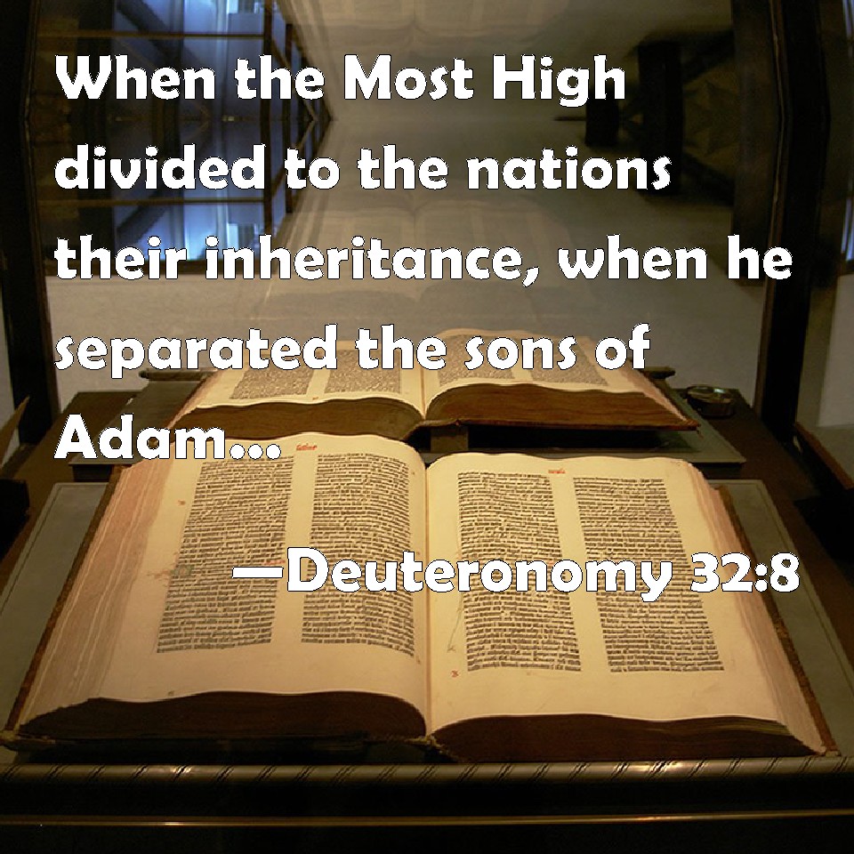 Choose a Background Deuteronomy 32:8 When the Most High divided to the nations their inheritance, when he separated the sons of Adam, he set the bounds of the people according to the number of the children of Israel. KJV: When the most High divided to the nations their inheritance, when he separated the sons of Adam, he set the bounds of the people according to the number of the children of Israel. DRB: When the Most High divided the nations: when he separated the sons of Adam, he appointed the bounds of people according to the number of the children of Israel. DBT: When the Most High assigned to the nations their inheritance, When he separated the sons of Adam, He set the bounds of the peoples According to the number of the children of Israel. ERV: When the Most High gave to the nations their inheritance, When he separated the children of men, He set the bounds of the peoples According to the number of the children of Israel. WBT: When the Most High divided to the nations their inheritance, when he separated the sons of Adam, he set the bounds of the people according to the number of the children of Israel. WEB: When the Most High gave to the nations their inheritance, when he separated the children of men, he set the bounds of the peoples according to the number of the children of Israel. YLT: In the Most High causing nations to inherit, In His separating sons of Adam — He setteth up the borders of the peoples By the number of the sons of Israel.Links Deuteronomy 32:8 NIV • Deuteronomy 32:8 NLT • Deuteronomy 32:8 ESV • Deuteronomy 32:8 NASB • Deuteronomy 32:8 KJV • Deuteronomy 32:8 Interlinear • Deuteronomy 32:8 Commentaries • Deuteronomy 32:8 Parallel Texts • Deuteronomy 32:8 Bible Apps • Deuteronomy 32:8 Parallel • Bible Hub |