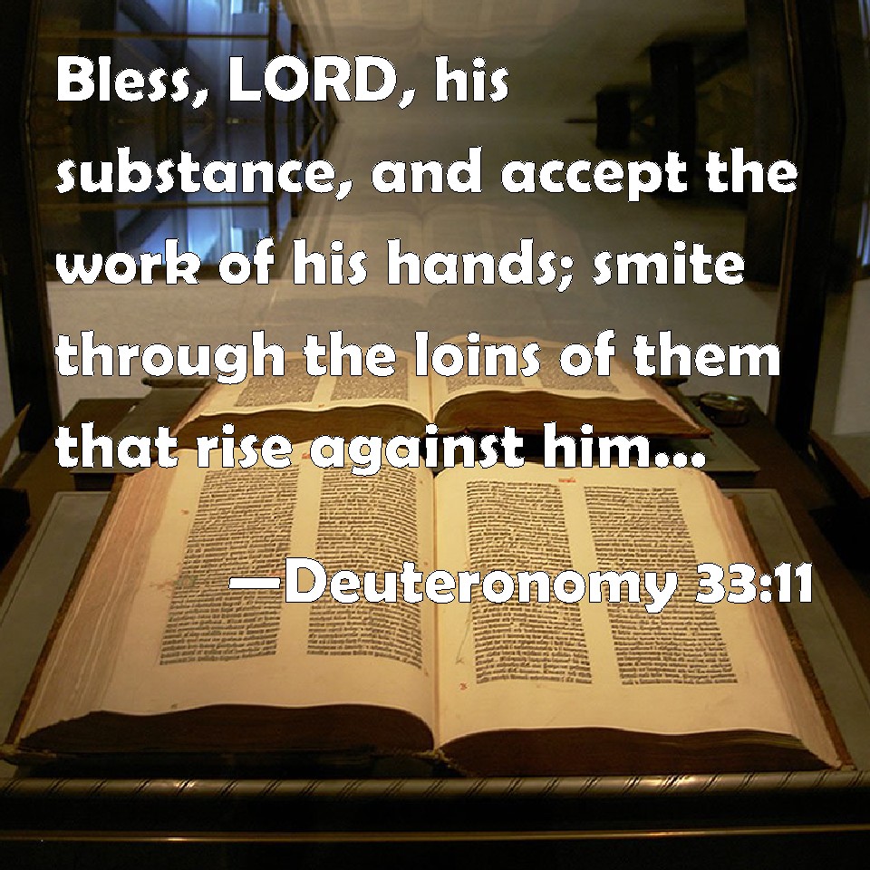 Choose a Background Deuteronomy 33:11 Bless, LORD, his substance, and accept the work of his hands; smite through the loins of them that rise against him, and of them that hate him, that they rise not again. KJV: Bless, LORD, his substance, and accept the work of his hands: smite through the loins of them that rise against him, and of them that hate him, that they rise not again. DRB: Bless, O Lord, his strength, and receive the works of his hands. Strike the backs of his enemies, and let not them that hate him rise. DBT: Bless, Jehovah, his substance! And let the work of his hands please thee; Crush the loins of his adversaries, And of them that hate him, that they may never rise again! ERV: Bless, LORD, his substance, And accept the work of his hands: Smite through the loins of them that rise up against him, And of them that hate him, that they rise not again. WBT: Bless, LORD, his substance, and accept the work of his hands: smite through the loins of them that rise against him, and of them that hate him, that they rise not again. WEB: Yahweh, bless his substance. Accept the work of his hands. Strike through the hips of those who rise up against him, of those who hate him, that they not rise again." YLT: Bless, O Jehovah, his strength, And the work of his hands Thou acceptest, Smite the loins of his withstanders, And of those hating him — that they rise not!Links Deuteronomy 33:11 NIV • Deuteronomy 33:11 NLT • Deuteronomy 33:11 ESV • Deuteronomy 33:11 NASB • Deuteronomy 33:11 KJV • Deuteronomy 33:11 Interlinear • Deuteronomy 33:11 Commentaries • Deuteronomy 33:11 Parallel Texts • Deuteronomy 33:11 Bible Apps • Deuteronomy 33:11 Parallel • Bible Hub |