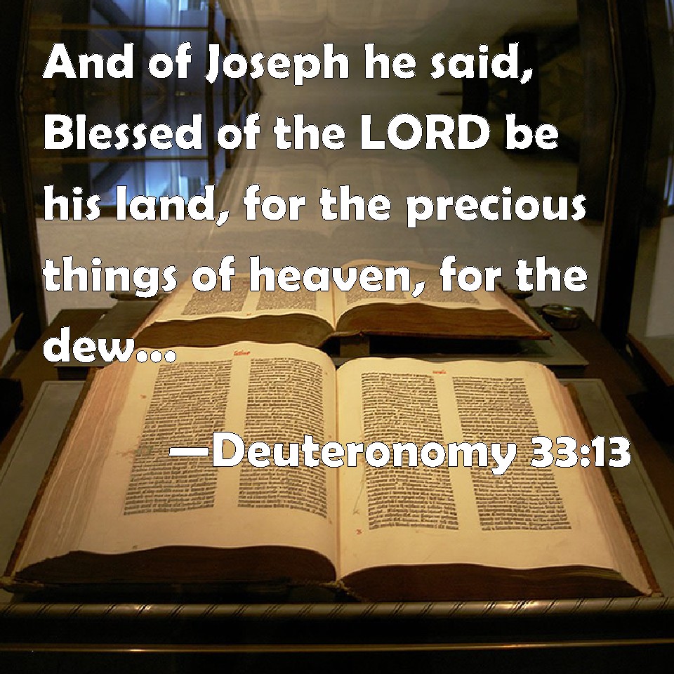 Choose a Background Deuteronomy 33:13 And of Joseph he said, Blessed of the LORD be his land, for the precious things of heaven, for the dew, and for the deep that coucheth beneath, KJV: And of Joseph he said, Blessed of the LORD be his land, for the precious things of heaven, for the dew, and for the deep that coucheth beneath, DRB: To Joseph also he said: Of the blessing of the Lord be his land, of the fruits of heaven, and of the dew, and of the deep that lieth beneath. DBT: And of Joseph he said, Blessed of Jehovah be his land! By the precious things of the heavens, By the dew, and by the deep that lieth beneath, ERV: And of Joseph he said, Blessed of the LORD be his land; For the precious things of heaven, for the dew, And for the deep that coucheth beneath, WBT: And of Joseph he said, Blessed of the LORD be his land, for the precious things of heaven, for the dew, and for the deep that coucheth beneath, WEB: Of Joseph he said, "His land is blessed by Yahweh, for the precious things of the heavens, for the dew, for the deep that couches beneath, YLT: And of Joseph he said: — Blessed of Jehovah is his land, By precious things of the heavens, By dew, and by the deep crouching beneath,Links Deuteronomy 33:13 NIV • Deuteronomy 33:13 NLT • Deuteronomy 33:13 ESV • Deuteronomy 33:13 NASB • Deuteronomy 33:13 KJV • Deuteronomy 33:13 Interlinear • Deuteronomy 33:13 Commentaries • Deuteronomy 33:13 Parallel Texts • Deuteronomy 33:13 Bible Apps • Deuteronomy 33:13 Parallel • Bible Hub |