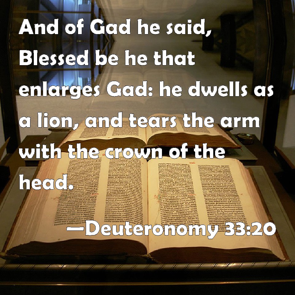 Choose a Background Deuteronomy 33:20 And of Gad he said, Blessed be he that enlarges Gad: he dwells as a lion, and tears the arm with the crown of the head. KJV: And of Gad he said, Blessed be he that enlargeth Gad: he dwelleth as a lion, and teareth the arm with the crown of the head. DRB: And to Gad he said: Blessed be Gad in his breadth: he hath rested as a lion, and hath seized upon the arm and the top of the head. DBT: And of Gad he said, Blessed be he that enlargeth Gad! As a lion doth he dwell, and teareth the arm, even the top of the head. ERV: And of Gad he said, Blessed be he that enlargeth Gad: He dwelleth as a lioness, And teareth the arm, yea, the crown of the head. WBT: And of Gad he said: Blessed be he that enlargeth Gad: he dwelleth as a lion, and teareth the arm with the crown of the head. WEB: Of Gad he said, "He who enlarges Gad is blessed. He dwells as a lioness, and tears the arm, yes, the crown of the head. YLT: And of Gad he said: — Blessed of the Enlarger is Gad, As a lioness he doth tabernacle, And hath torn the arm — also the crown!Links Deuteronomy 33:20 NIV • Deuteronomy 33:20 NLT • Deuteronomy 33:20 ESV • Deuteronomy 33:20 NASB • Deuteronomy 33:20 KJV • Deuteronomy 33:20 Interlinear • Deuteronomy 33:20 Commentaries • Deuteronomy 33:20 Parallel Texts • Deuteronomy 33:20 Bible Apps • Deuteronomy 33:20 Parallel • Bible Hub |