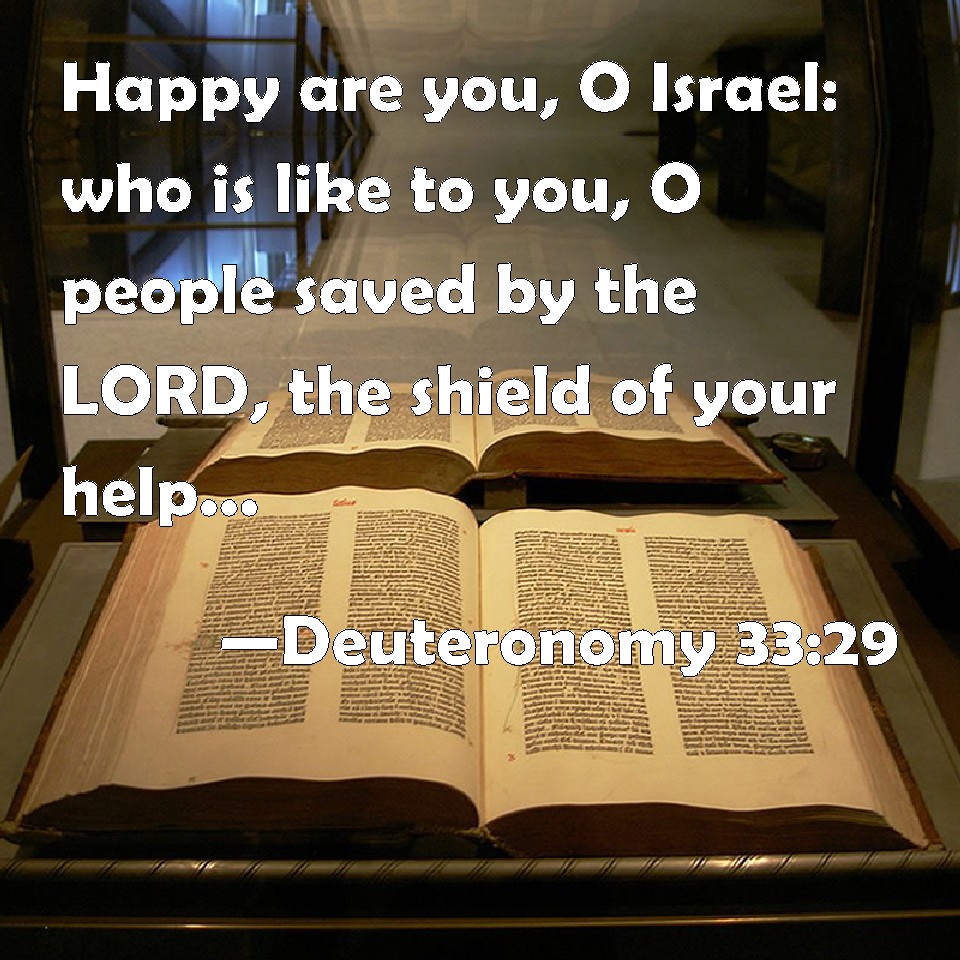 Choose a Background Deuteronomy 33:29 Happy are you, O Israel: who is like to you, O people saved by the LORD, the shield of your help, and who is the sword of your excellency! and your enemies shall be found liars to you; and you shall tread on their high places. KJV: Happy art thou, O Israel: who is like unto thee, O people saved by the LORD, the shield of thy help, and who is the sword of thy excellency! and thine enemies shall be found liars unto thee; and thou shalt tread upon their high places. DRB: Blessed are thou, Israel: who is like to thee, O people, that art saved by the Lord? the shield of thy help, and the sword of thy glory: thy enemies shall deny thee, and thou shalt tread upon their necks. DBT: Happy art thou, Israel! Who is like unto thee, a people saved by Jehovah, The shield of thy help, And the sword of thine excellency? And thine enemies shall come cringing to thee; And thou shalt tread upon their high places. ERV: Happy art thou, O Israel: Who is like unto thee, a people saved by the LORD, The shield of thy help, And that is the sword of thy excellency! And thine enemies shall submit themselves unto thee; And thou shalt tread upon their high places. WBT: Happy art thou, O Israel: who is like to thee, O people saved by the LORD, the shield of thy help, and who is the sword of thy excellence! and thy enemies shall be found liars to thee; and thou shalt tread upon their high places. WEB: You are happy, Israel. Who is like you, a people saved by Yahweh, the shield of your help, the sword of your excellency! Your enemies shall submit themselves to you. You shall tread on their high places." YLT: O thy happiness, O Israel! who is like thee? A people saved by Jehovah, The shield of thy help, And He who is the sword of thine excellency: And thine enemies are subdued for thee, And thou on their high places dost tread.'Links Deuteronomy 33:29 NIV • Deuteronomy 33:29 NLT • Deuteronomy 33:29 ESV • Deuteronomy 33:29 NASB • Deuteronomy 33:29 KJV • Deuteronomy 33:29 Interlinear • Deuteronomy 33:29 Commentaries • Deuteronomy 33:29 Parallel Texts • Deuteronomy 33:29 Bible Apps • Deuteronomy 33:29 Parallel • Bible Hub |