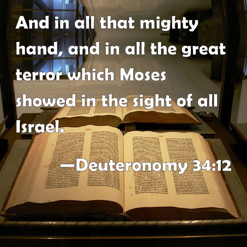 Choose a Background Deuteronomy 34:12 And in all that mighty hand, and in all the great terror which Moses showed in the sight of all Israel. KJV: And in all that mighty hand, and in all the great terror which Moses shewed in the sight of all Israel. DRB: And all the mighty hand, and great miracles, which Moses did before all Israel. DBT: and according to all that mighty hand; and according to all the great terribleness that Moses had wrought in the sight of all Israel. ERV: and in all the mighty hand, and in all the great terror, which Moses wrought in the sight of all Israel. WBT: And in all that mighty hand, and in all the great terror which Moses showed in the sight of all Israel. WEB: and in all the mighty hand, and in all the great terror, which Moses worked in the sight of all Israel. YLT: and in reference to all the strong hand, and to all the great fear which Moses did before the eyes of all Israel.Links Deuteronomy 34:12 NIV • Deuteronomy 34:12 NLT • Deuteronomy 34:12 ESV • Deuteronomy 34:12 NASB • Deuteronomy 34:12 KJV • Deuteronomy 34:12 Interlinear • Deuteronomy 34:12 Commentaries • Deuteronomy 34:12 Parallel Texts • Deuteronomy 34:12 Bible Apps • Deuteronomy 34:12 Parallel • Bible Hub |