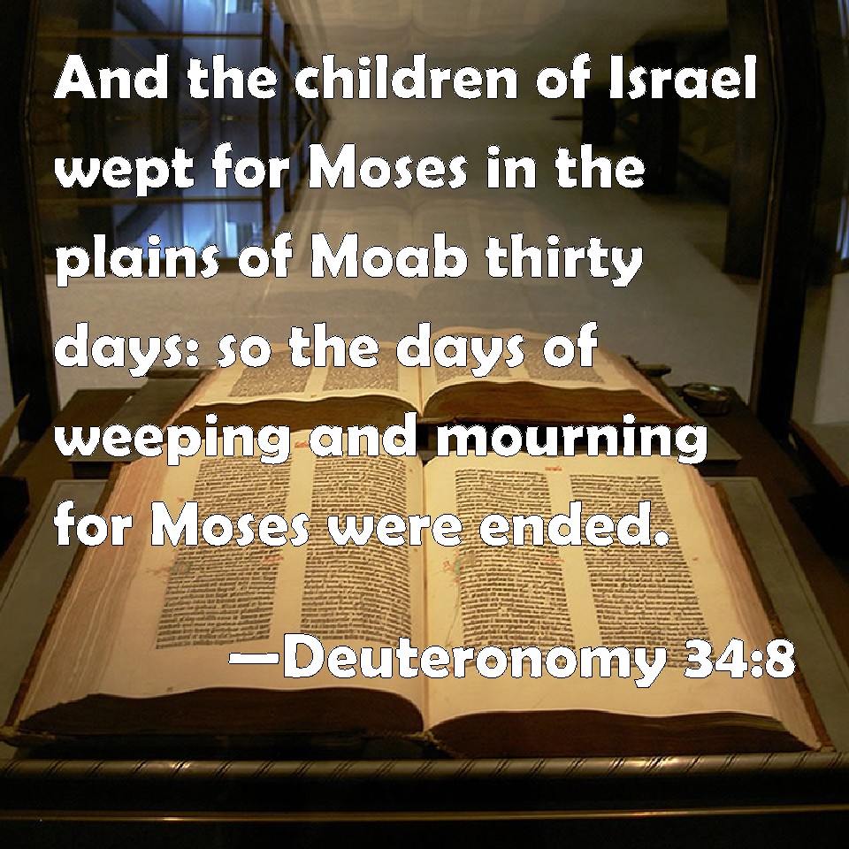 Deuteronomy 34:8 And the children of Israel wept for Moses in the plains of Moab thirty days: so the days of weeping and mourning for Moses were ended.