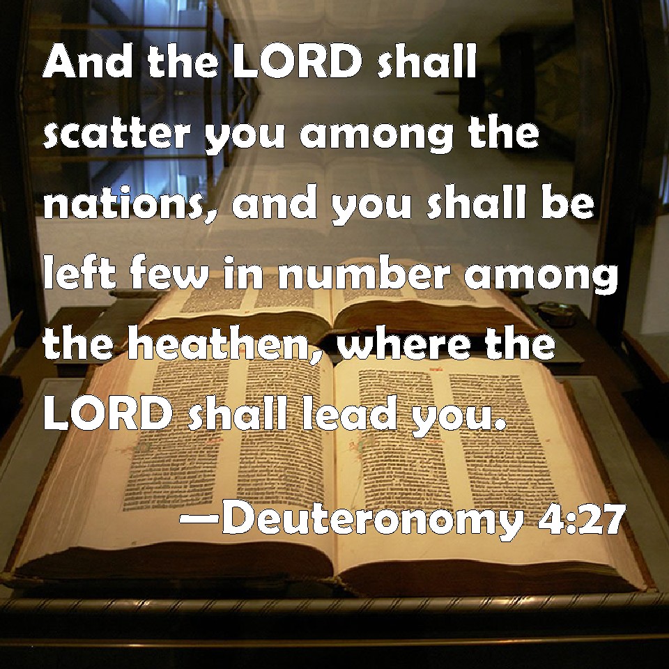 Choose a Background Deuteronomy 4:27 And the LORD shall scatter you among the nations, and you shall be left few in number among the heathen, where the LORD shall lead you. KJV: And the LORD shall scatter you among the nations, and ye shall be left few in number among the heathen, whither the LORD shall lead you. DRB: And scatter you among all nations, and you shall remain a few among the nations, to which the Lord shall lead you. DBT: And Jehovah will scatter you among the peoples, and ye shall be left a small company among the nations to which Jehovah will lead you. ERV: And the LORD shall scatter you among the peoples, and ye shall be left few in number among the nations, whither the LORD shall lead you away. WBT: And the LORD shall scatter you among the nations, and ye shall be left few in number among the heathen, whither the LORD shall lead you. WEB: Yahweh will scatter you among the peoples, and you shall be left few in number among the nations, where Yahweh shall lead you away. YLT: and Jehovah hath scattered you among the peoples, and ye have been left few in number among the nations, whither Jehovah leadeth you,Links Deuteronomy 4:27 NIV • Deuteronomy 4:27 NLT • Deuteronomy 4:27 ESV • Deuteronomy 4:27 NASB • Deuteronomy 4:27 KJV • Deuteronomy 4:27 Interlinear • Deuteronomy 4:27 Commentaries • Deuteronomy 4:27 Parallel Texts • Deuteronomy 4:27 Bible Apps • Deuteronomy 4:27 Parallel • Bible Hub |