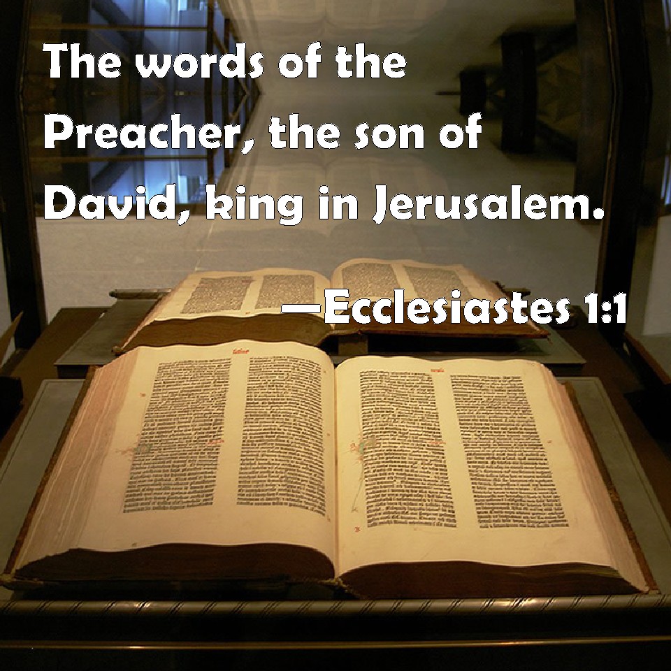 Choose a Background Ecclesiastes 1:1 The words of the Preacher, the son of David, king in Jerusalem. KJV: The words of the Preacher, the son of David, king in Jerusalem. DRB: The words of Ecclesiastes, the son of David, king of Jerusalem. DBT: The words of the Preacher, the son of David, king in Jerusalem. ERV: The words of the Preacher, the son of David, king in Jerusalem. WBT: The words of the preacher, the son of David, king of Jerusalem. WEB: The words of the Preacher, the son of David, king in Jerusalem: YLT: Words of a preacher, son of David, king in Jerusalem:Links Ecclesiastes 1:1 NIV • Ecclesiastes 1:1 NLT • Ecclesiastes 1:1 ESV • Ecclesiastes 1:1 NASB • Ecclesiastes 1:1 KJV • Ecclesiastes 1:1 Interlinear • Ecclesiastes 1:1 Commentaries • Ecclesiastes 1:1 Parallel Texts • Ecclesiastes 1:1 Bible Apps • Ecclesiastes 1:1 Parallel • Bible Hub |