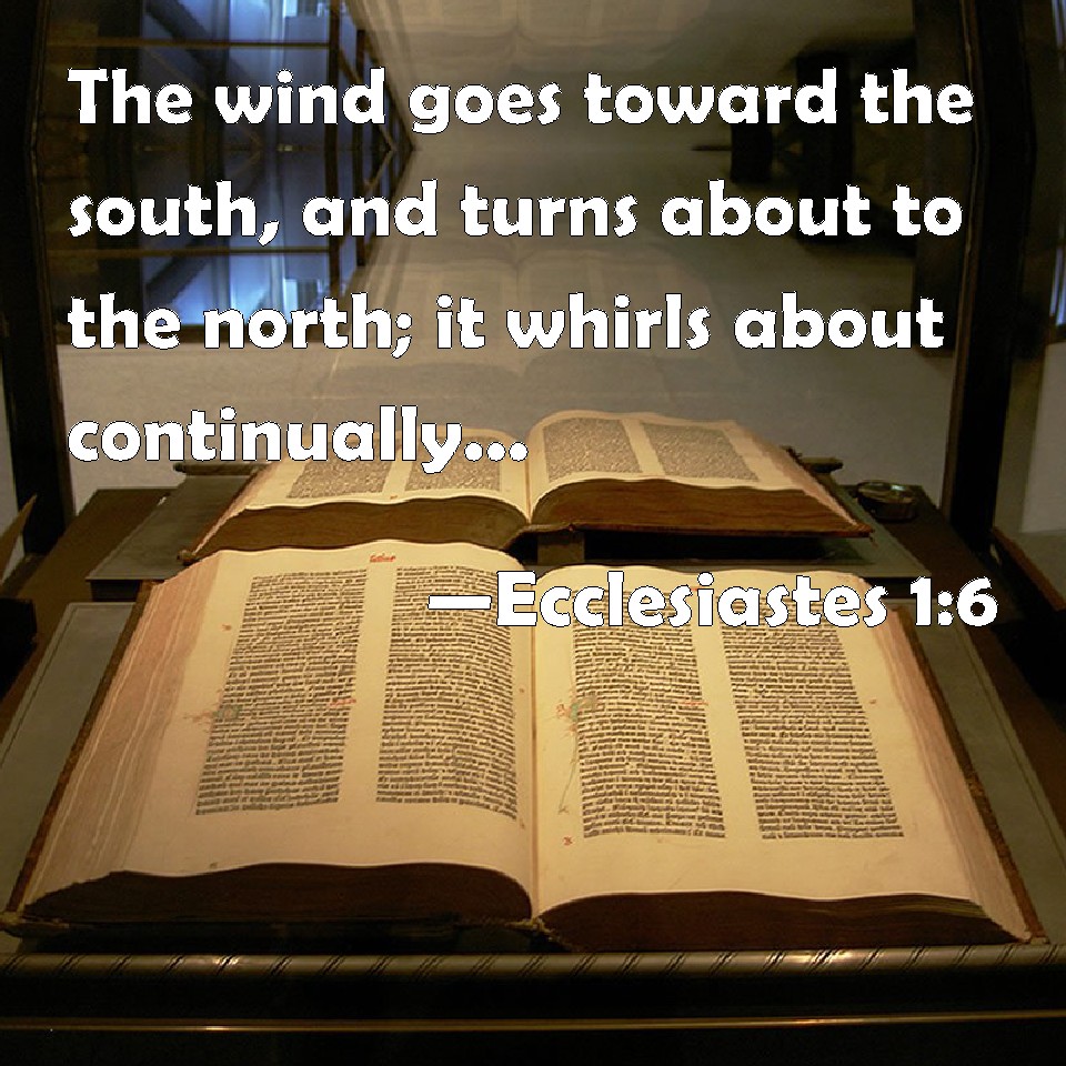 Choose a Background Ecclesiastes 1:6 The wind goes toward the south, and turns about to the north; it whirls about continually, and the wind returns again according to his circuits. KJV: The wind goeth toward the south, and turneth about unto the north; it whirleth about continually, and the wind returneth again according to his circuits. DRB: Maketh his round by the south, and turneth again to the north: the spirit goeth forward surveying all places round about, and returneth to his circuits. DBT: The wind goeth towards the south, and turneth about towards the north: it turneth about continually, and the wind returneth again to its circuits. ERV: The wind goeth toward the south, and turneth about unto the north; it turneth about continually in its course, and the wind returneth again to its circuits. WBT: The wind goeth towards the south, and turneth about to the north; it whirleth about continually, and the wind returneth again according to its circuits. WEB: The wind goes toward the south, and turns around to the north. It turns around continually as it goes, and the wind returns again to its courses. YLT: Going unto the south, and turning round unto the north, turning round, turning round, the wind is going, and by its circuits the wind hath returned.Links Ecclesiastes 1:6 NIV • Ecclesiastes 1:6 NLT • Ecclesiastes 1:6 ESV • Ecclesiastes 1:6 NASB • Ecclesiastes 1:6 KJV • Ecclesiastes 1:6 Interlinear • Ecclesiastes 1:6 Commentaries • Ecclesiastes 1:6 Parallel Texts • Ecclesiastes 1:6 Bible Apps • Ecclesiastes 1:6 Parallel • Bible Hub |