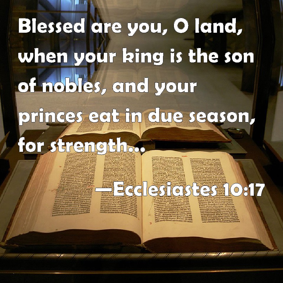 Choose a Background Ecclesiastes 10:17 Blessed are you, O land, when your king is the son of nobles, and your princes eat in due season, for strength, and not for drunkenness! KJV: Blessed art thou, O land, when thy king is the son of nobles, and thy princes eat in due season, for strength, and not for drunkenness! DRB: Blessed is the land, whose king is noble, and whose princes eat in due season for refreshment, and not for riotousness. DBT: Happy art thou, O land, when thy king is a son of nobles, and thy princes eat in due season, for strength, and not for drunkenness! ERV: Happy art thou, O land, when thy king is the son of nobles, and thy princes eat in due season, for strength, and not for drunkenness! WBT: Blessed art thou, O land, when thy king is the son of nobles, and thy princes eat in due season, for strength, and not for drunkenness! WEB: Happy are you, land, when your king is the son of nobles, and your princes eat in due season, for strength, and not for drunkenness! YLT: Happy art thou, O land, When thy king is a son of freemen, And thy princes do eat in due season, For might, and not for drunkenness.Links Ecclesiastes 10:17 NIV • Ecclesiastes 10:17 NLT • Ecclesiastes 10:17 ESV • Ecclesiastes 10:17 NASB • Ecclesiastes 10:17 KJV • Ecclesiastes 10:17 Interlinear • Ecclesiastes 10:17 Commentaries • Ecclesiastes 10:17 Parallel Texts • Ecclesiastes 10:17 Bible Apps • Ecclesiastes 10:17 Parallel • Bible Hub |