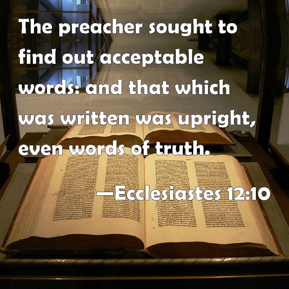 Choose a Background Ecclesiastes 12:10 The preacher sought to find out acceptable words: and that which was written was upright, even words of truth. KJV: The preacher sought to find out acceptable words: and that which was written was upright, even words of truth. DRB: He sought profitable words, and wrote words most right, and full of truth. DBT: The Preacher sought to find out acceptable words; and that which was written is upright, words of truth. ERV: The Preacher sought to find out acceptable words, and that which was written uprightly, even words of truth. WBT: The preacher sought to find out acceptable words: and that which was written was upright, even words of truth. WEB: The Preacher sought to find out acceptable words, and that which was written blamelessly, words of truth. YLT: The preacher sought to find out pleasing words, and, written by the upright, words of truth.Links Ecclesiastes 12:10 NIV • Ecclesiastes 12:10 NLT • Ecclesiastes 12:10 ESV • Ecclesiastes 12:10 NASB • Ecclesiastes 12:10 KJV • Ecclesiastes 12:10 Interlinear • Ecclesiastes 12:10 Commentaries • Ecclesiastes 12:10 Parallel Texts • Ecclesiastes 12:10 Bible Apps • Ecclesiastes 12:10 Parallel • Bible Hub |