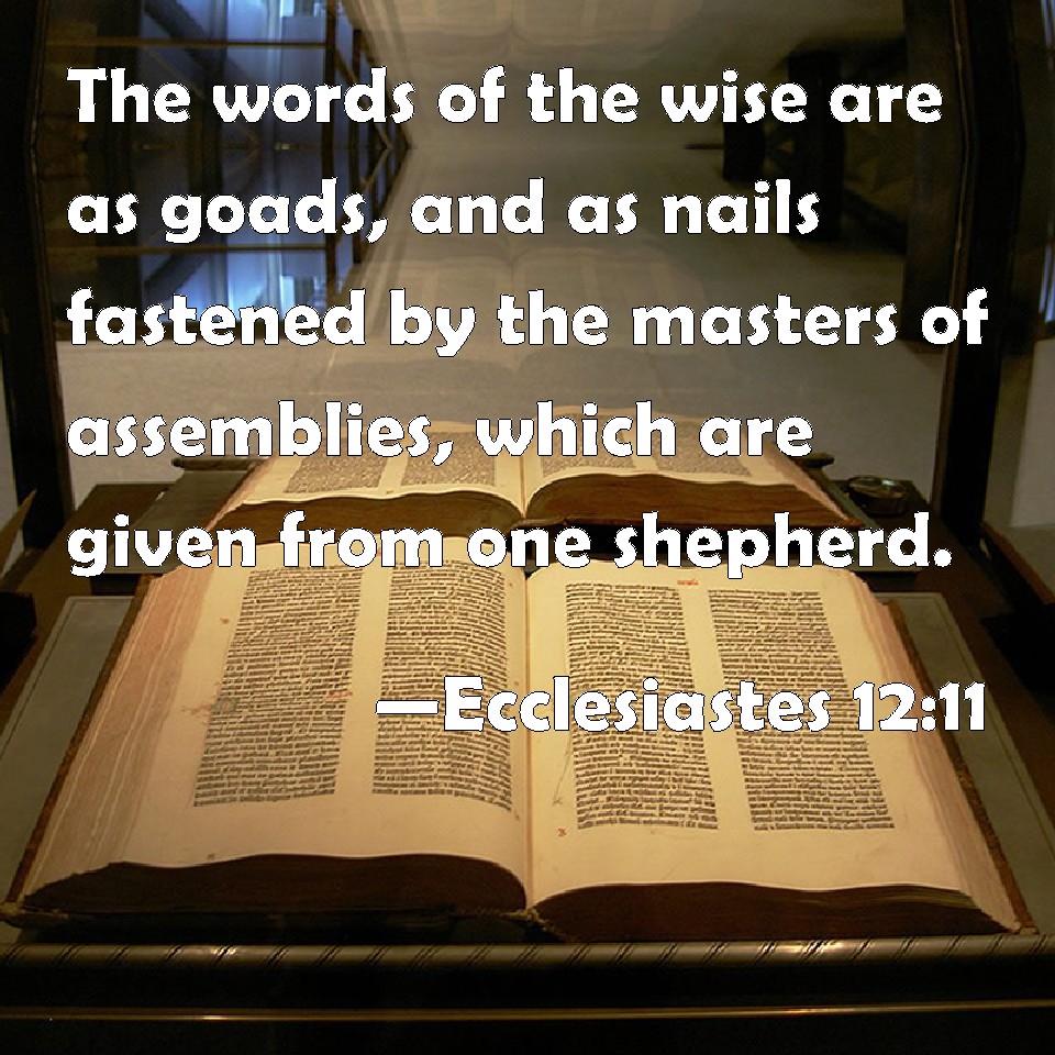 Choose a Background Ecclesiastes 12:11 The words of the wise are as goads, and as nails fastened by the masters of assemblies, which are given from one shepherd. KJV: The words of the wise are as goads, and as nails fastened by the masters of assemblies, which are given from one shepherd. DRB: The words of the wise are as goads, and as nails deeply fastened in, which by the counsel of masters are given from one shepherd. DBT: The words of the wise are as goads, and the collections of them as nails fastened in: they are given from one shepherd. ERV: The words of the wise are as goads, and as nails well fastened are the words of the masters of assemblies, which are given from one shepherd. WBT: The words of the wise are as goads, and as nails fastened by the masters of assemblies, which are given from one shepherd. WEB: The words of the wise are like goads; and like nails well fastened are words from the masters of assemblies, which are given from one shepherd. YLT: Words of the wise are as goads, and as fences planted by the masters of collections, they have been given by one shepherd.Links Ecclesiastes 12:11 NIV • Ecclesiastes 12:11 NLT • Ecclesiastes 12:11 ESV • Ecclesiastes 12:11 NASB • Ecclesiastes 12:11 KJV • Ecclesiastes 12:11 Interlinear • Ecclesiastes 12:11 Commentaries • Ecclesiastes 12:11 Parallel Texts • Ecclesiastes 12:11 Bible Apps • Ecclesiastes 12:11 Parallel • Bible Hub |