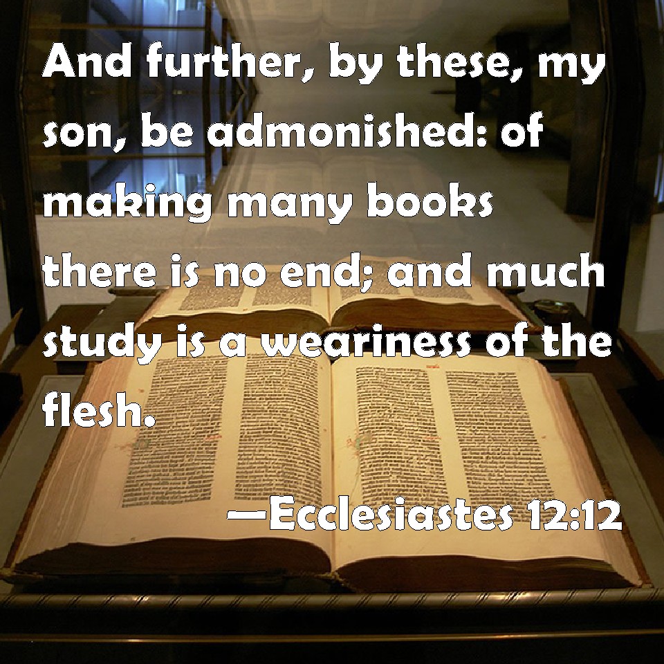 Choose a Background Ecclesiastes 12:12 And further, by these, my son, be admonished: of making many books there is no end; and much study is a weariness of the flesh. KJV: And further, by these, my son, be admonished: of making many books there is no end; and much study is a weariness of the flesh. DRB: More than these, my son, require not. Of making many books there is no end: and much study is an affliction of the flesh. DBT: And besides, my son, be warned by them: of making many books there is no end, and much study is a weariness of the flesh. ERV: And furthermore, my son, be admonished: of making many books there is no end; and much study is a weariness of the flesh. WBT: And further, by these, my son, be admonished: of making many books there is no end; and much study is a weariness of the flesh. WEB: Furthermore, my son, be admonished: of making many books there is no end; and much study is a weariness of the flesh. YLT: And further, from these, my son, be warned; the making of many books hath no end, and much study is a weariness of the flesh.Links Ecclesiastes 12:12 NIV • Ecclesiastes 12:12 NLT • Ecclesiastes 12:12 ESV • Ecclesiastes 12:12 NASB • Ecclesiastes 12:12 KJV • Ecclesiastes 12:12 Interlinear • Ecclesiastes 12:12 Commentaries • Ecclesiastes 12:12 Parallel Texts • Ecclesiastes 12:12 Bible Apps • Ecclesiastes 12:12 Parallel • Bible Hub |