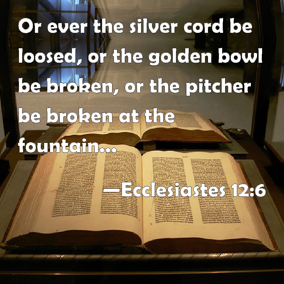 Choose a Background Ecclesiastes 12:6 Or ever the silver cord be loosed, or the golden bowl be broken, or the pitcher be broken at the fountain, or the wheel broken at the cistern. KJV: Or ever the silver cord be loosed, or the golden bowl be broken, or the pitcher be broken at the fountain, or the wheel broken at the cistern. DRB: Before the silver cord be broken, and the golden fillet shrink back, and the pitcher be crushed at the fountain, and the wheel be broken upon the cistern, DBT: before the silver cord be loosed, or the golden bowl be broken, or the pitcher be shattered at the fountain, or the wheel be broken at the cistern; ERV: or ever the silver cord be loosed, or the golden bowl be broken, or the pitcher be broken at the fountain, or the wheel broken at the cistern; WBT: Or ever the silver cord shall be loosed, or the golden bowl be broken, or the pitcher be broken at the fountain, or the wheel broken at the cistern. WEB: before the silver cord is severed, or the golden bowl is broken, or the pitcher is broken at the spring, or the wheel broken at the cistern, YLT: While that the silver cord is not removed, And the golden bowl broken, And the pitcher broken by the fountain, And the wheel broken at the well.Links Ecclesiastes 12:6 NIV • Ecclesiastes 12:6 NLT • Ecclesiastes 12:6 ESV • Ecclesiastes 12:6 NASB • Ecclesiastes 12:6 KJV • Ecclesiastes 12:6 Interlinear • Ecclesiastes 12:6 Commentaries • Ecclesiastes 12:6 Parallel Texts • Ecclesiastes 12:6 Bible Apps • Ecclesiastes 12:6 Parallel • Bible Hub |