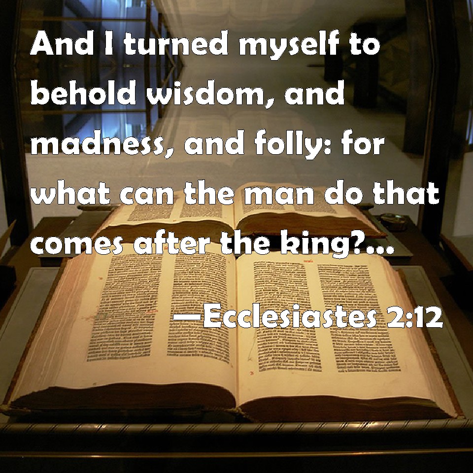 Choose a Background Ecclesiastes 2:12 And I turned myself to behold wisdom, and madness, and folly: for what can the man do that comes after the king? even that which has been already done. KJV: And I turned myself to behold wisdom, and madness, and folly: for what can the man do that cometh after the king? even that which hath been already done. DRB: I passed further to behold wisdom, and errors and folly, (What is man, said I, that he can follow the King his maker?) DBT: And I turned myself to behold wisdom, and madness, and folly; for what shall the man do that cometh after the king? that which hath already been done. ERV: And I turned myself to behold wisdom, and madness and folly; for what can the man do that cometh after the king? even that which hath been already done. WBT: And I turned myself to behold wisdom, and madness, and folly: for what can the man do that cometh after the king? even that which hath been already done. WEB: I turned myself to consider wisdom, madness, and folly: for what can the king's successor do? Just that which has been done long ago. YLT: And I turned to see wisdom, and madness, and folly, but what is the man who cometh after the king? that which is already — they have done it!Links Ecclesiastes 2:12 NIV • Ecclesiastes 2:12 NLT • Ecclesiastes 2:12 ESV • Ecclesiastes 2:12 NASB • Ecclesiastes 2:12 KJV • Ecclesiastes 2:12 Interlinear • Ecclesiastes 2:12 Commentaries • Ecclesiastes 2:12 Parallel Texts • Ecclesiastes 2:12 Bible Apps • Ecclesiastes 2:12 Parallel • Bible Hub |