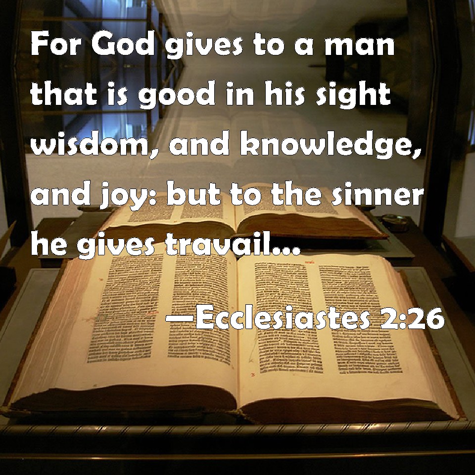 Ecclesiastes 2:26 For God gives to a man that is good in his sight wisdom, and knowledge, and joy: but to the sinner he gives travail, to gather and to heap up, that he may give to him that is good before God. This also is vanity and vexation of spirit.